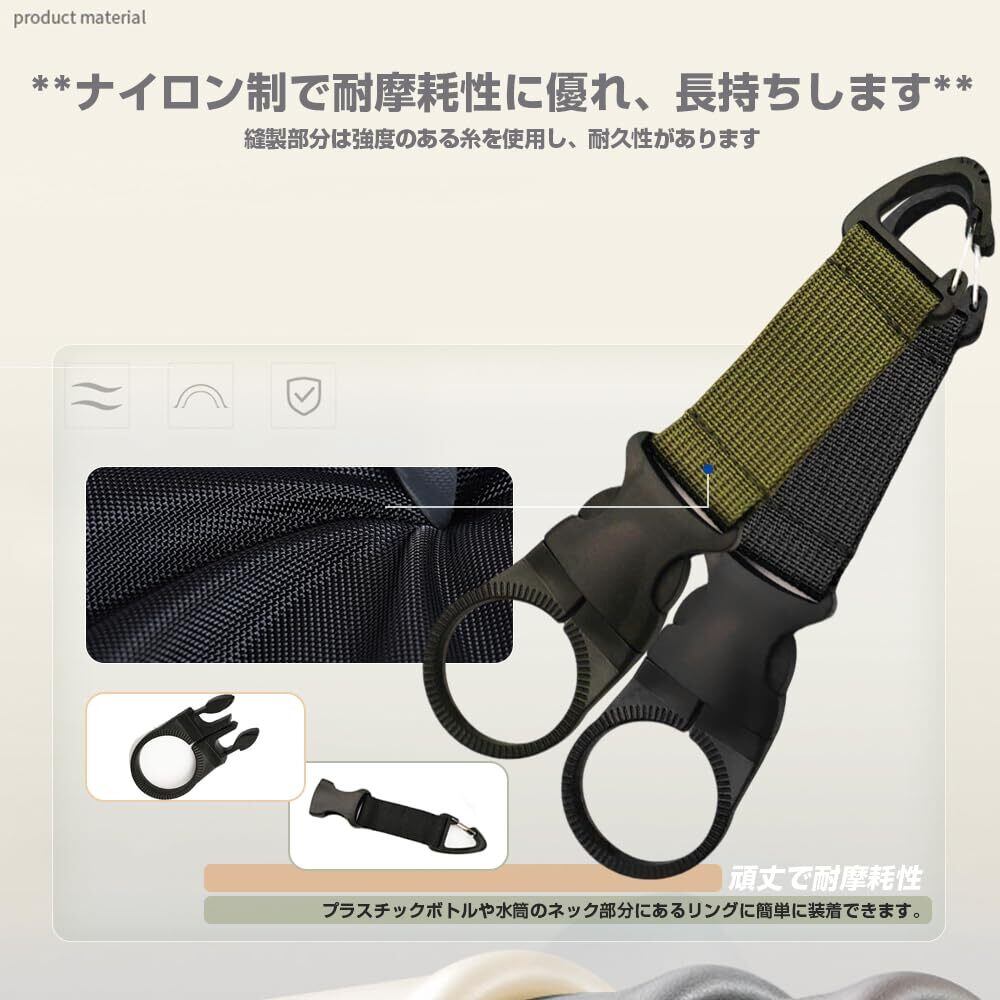 - ️【3. 高品質素材と耐久性】金属部分は錆びにくいアルミニウム製で、長期間使用しても安心。シリコン製のホルダー部分は柔軟かつ丈夫で、水筒やペットボトルをしっかりホールドします。縫製部分も補強されており、摩耗に強く実用性のある作りとなっています。