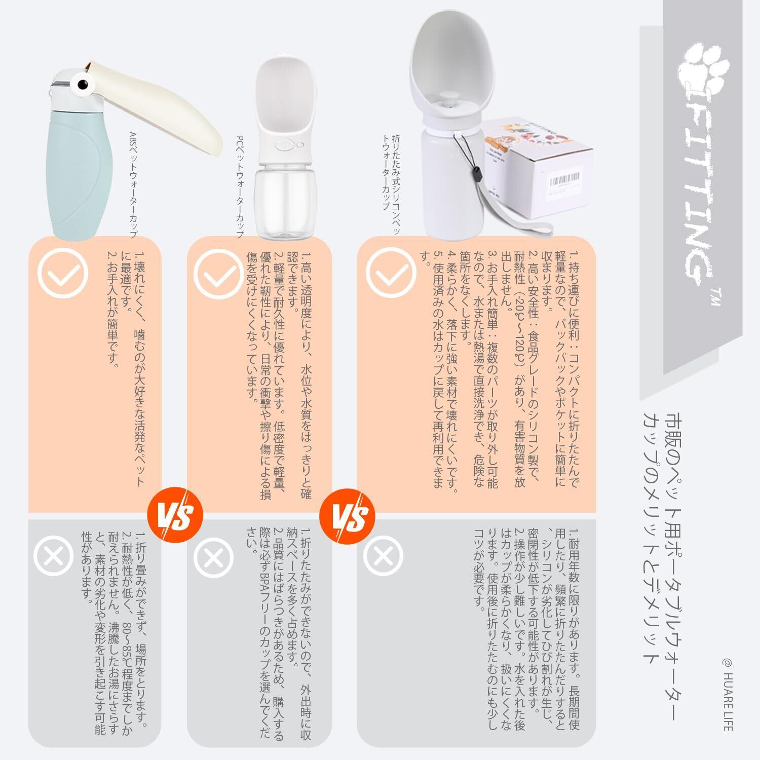 「ペットウォーターボトルの機能」 広げた状態でペット用ウォーターボトルの口が広く、ペットが水を飲むのに便利です。 底には餌を入れることができるので、ペットの餌やりに便利です。 ペットウォーターボトルは用途が広く、犬猫などの水や食べ物を入れるのに使用できます。