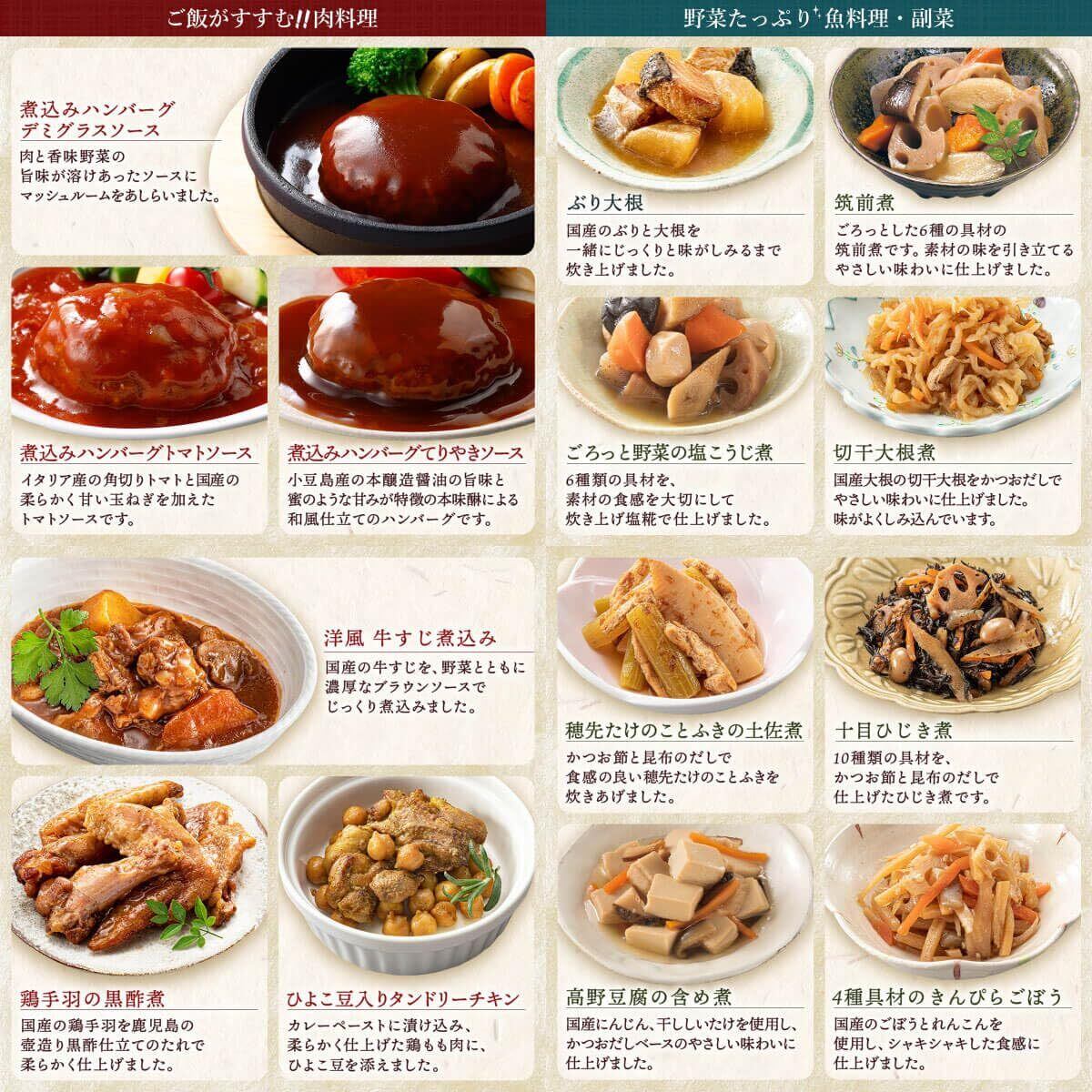 セット内容 : 煮込みハンバーグ デミグラスソース ×1/ 煮込みハンバーグ トマトソース ×1/ 煮込みハンバーグ テリヤキソース ×1/ ビーフシチュー ×1/ チキンクリームシチュー ×1/ コーンポタージュスープ ×1/ パンプキンポタージュスープ ×1/ ぶり大根 ×1/ 鶏手羽の黒酢煮 ×1/ ひよこ豆入りタンドリーチキン ×1/ 洋風牛すじ煮込み ×1/ 筑前煮 ×1/ 高野豆腐の含め煮 ×1/ 4種具材のきんぴらごぼう ×1/ ごろっと野菜の塩こうじ煮 ×1/ 切干大根煮 ×1/ 穂先たけのことふきの土佐煮 ×1/ 十目ひじき煮 ×1/ 国産乾燥野菜 ×1