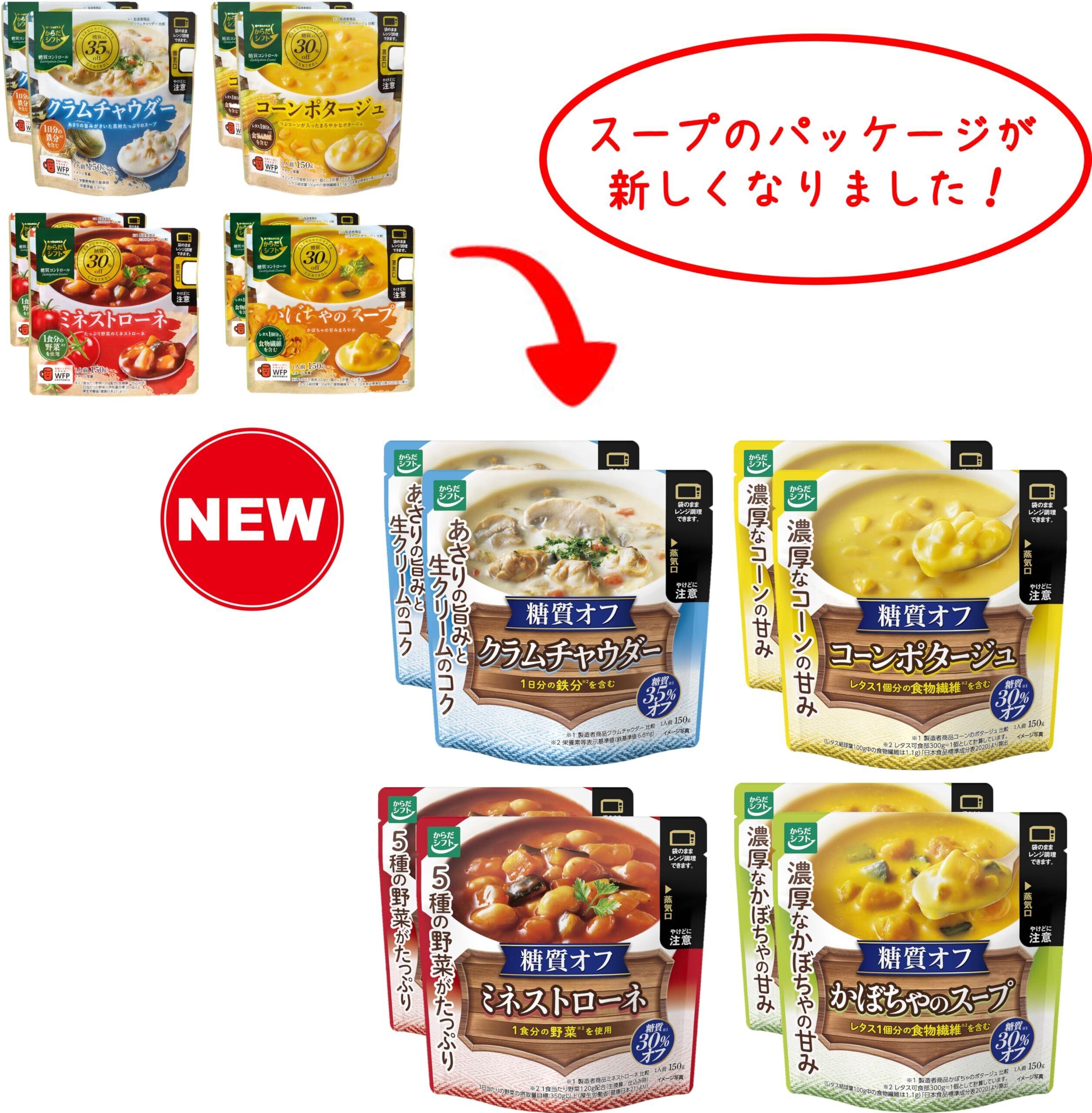 クラムチャウダー:油脂加工食品(食用油脂、還元水あめ)(国内製造)、たまねぎ、マッシュルーム水煮(マッシュルーム、食塩)、あさり、貝エキス、にんじん、バター、食用なたね油、クリーム、ポークエキス、ナチュラルチーズ、酵母エキス、香辛料/糊料(加工デンプン、増粘多糖類)、調味料(アミノ酸等)、カゼインNa、リン酸塩(Na)、ピロリン酸第二鉄、くん液、pH調整剤、乳化剤、香料、(一部に乳成分・豚肉を含む) コーンポタージュ:スイートコーン(国産、タイ産)、油脂加工食品(食用油脂、還元水あめ)、オニオンソテー、難消化性デキストリン、小麦粉、チキンエキス、食塩、酵母エキス、香辛料/調味料(アミノ酸等)、糊料(増粘多糖類)、カゼインNa、リン酸塩(Na)、甘味料(アセスルファムK)、香料、pH調整剤、乳化剤、着色料(カロチノイド)、(一部に小麦・乳成分・大豆・鶏肉を含む) ミネストローネ:大豆(国産)、トマトペースト、たまねぎ、ズッキーニ、にんじん、食用なたね油、トマト発酵液、ポークエキス、チキンエキス調味料、ごぼう水煮、香辛料、食塩、ナチュラルチーズ、酵母エキス/糊料(加工デンプン、キサンタン)、調味料(アミノ酸等)、くん液、乳化剤、(一部に小麦・乳成分・大豆・鶏肉・豚肉を含む) かぼちゃのスープ:かぼちゃペースト(国内製造)、かぼちゃ、油脂加工食品(食用油脂、還元水あめ)、オニオンソテー、小麦粉、難消化性デキストリン、クリーム、食塩、チキンエキス、酵母エキス、香辛料/pH調整剤、糊料(増粘多糖類)、調味料(アミノ酸)、カゼインNa、リン酸塩(Na)、甘味料(アセスルファムK)、乳化剤、(一部に小麦・乳成分・鶏肉を含む)