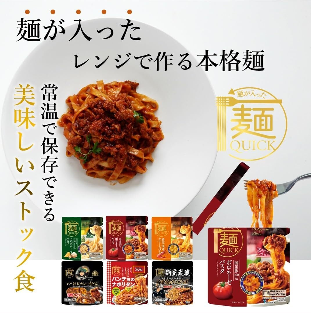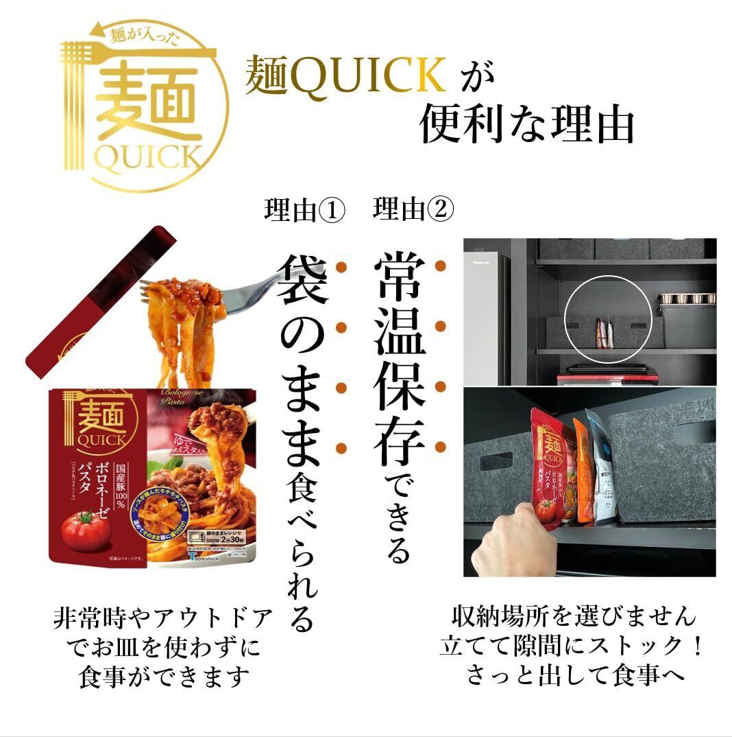 「麺QUICK」は電子レンジで温めるだけ(湯煎も可)で手軽に食べられる本格麺です。常温で保存できるので、忙しい毎日の常備食に、いざという時の備蓄食に、便利でおいしいストック食として活躍します。