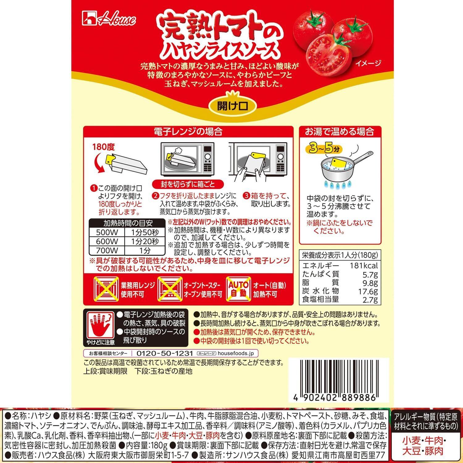 ・完熟トマトの濃厚なうまみと甘み、ほどよい酸味が特徴のまろやかなハヤシライスソースです。(トマトはペーストを使用)・具材として牛肉、玉ねぎ、マッシュルームが入っています。・湯煎だけではなく箱のまま電子レンジで温めることもできます。