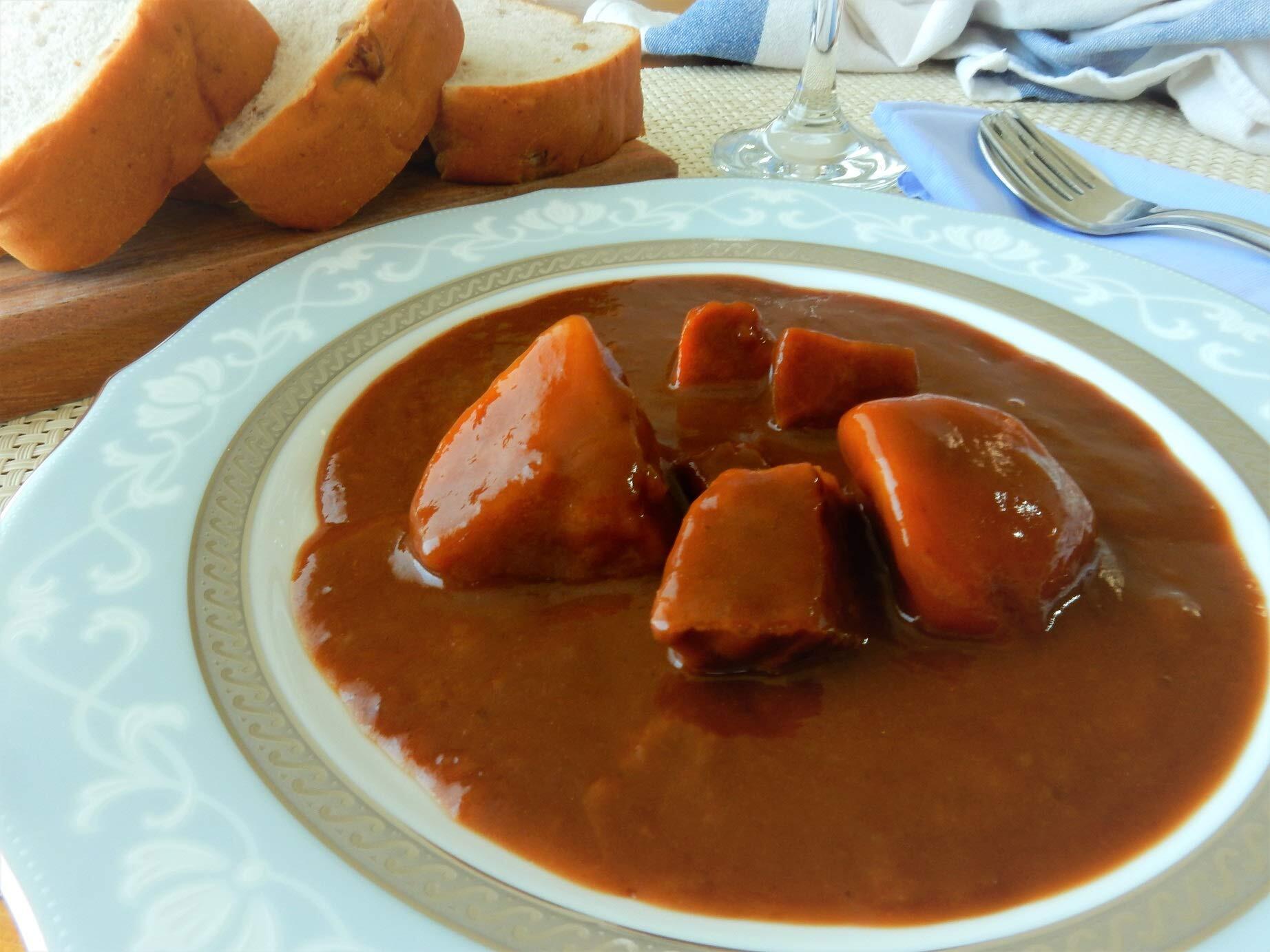原材料:野菜(じゃがいも、人参)、牛肉、ソテーオニオン、小麦粉、ラード、赤ワイン、砂糖、食塩、ビーフエキス調味料、トマトペースト、デミグラスソース、ビーフ香味調味料、香辛料、にんにくペースト/調味料(アミノ酸等)、カラメル色素、増粘剤(加工でん粉)、香料、(一部に小麦・牛肉・大豆・鶏肉・ゼラチンを含む)