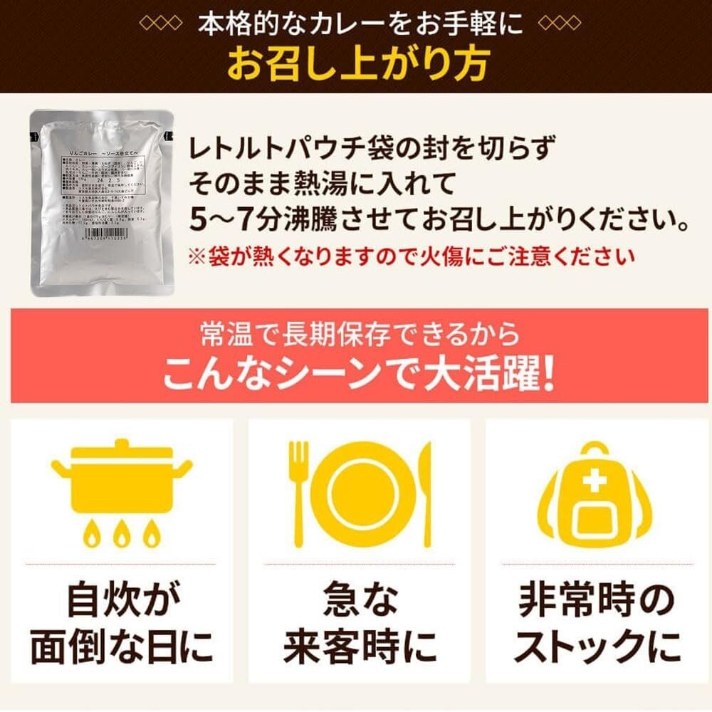 りんごピューレ(国内製造)、ソテーオニオン、カレールウ、にんじん、ビーフブイヨン、酵母エキス、肉エキス、カレー粉/カラメル色素、(一部に小麦・乳成分・りんご・牛肉・豚肉・鶏肉を含む)