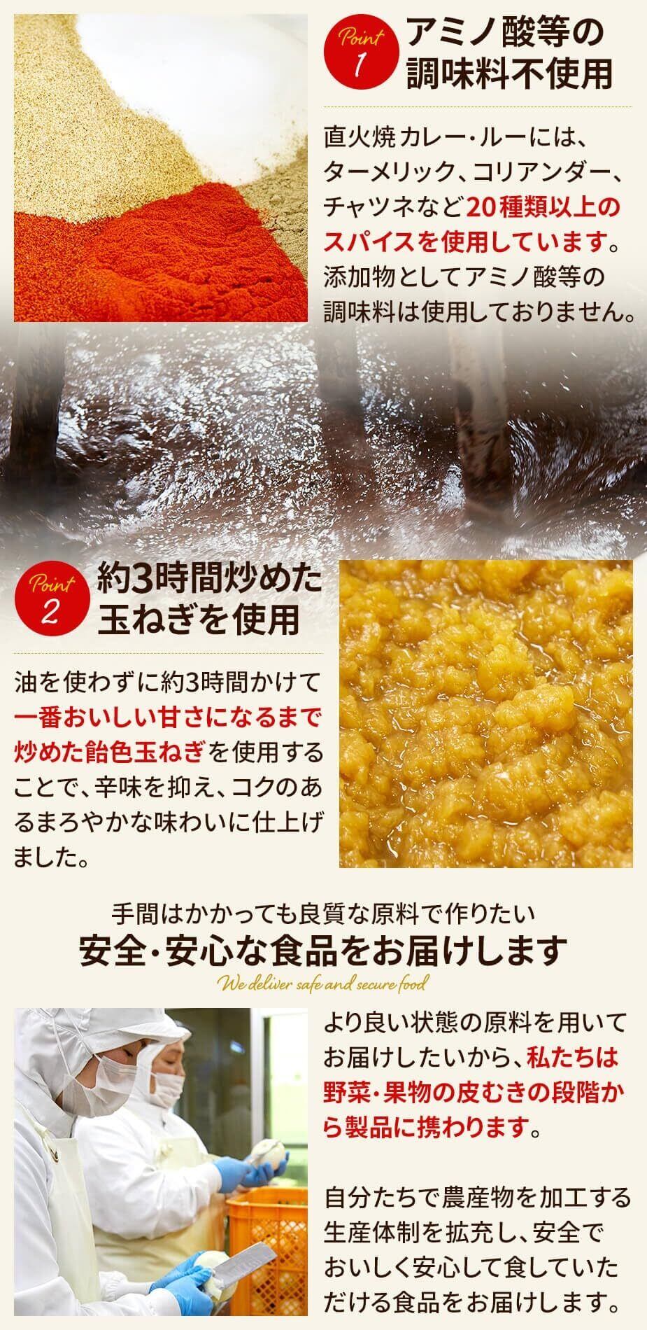 野菜果実の原料割合がなんと47.9%とおよそ半分は野菜果実でできたカレーソースです。本当に美味しいカレーをお届けする為に守り続けている「コスモ直火焼き製法」 手間を惜しまず味を犠牲にしない「直火焼き製法」で作り続けています。
