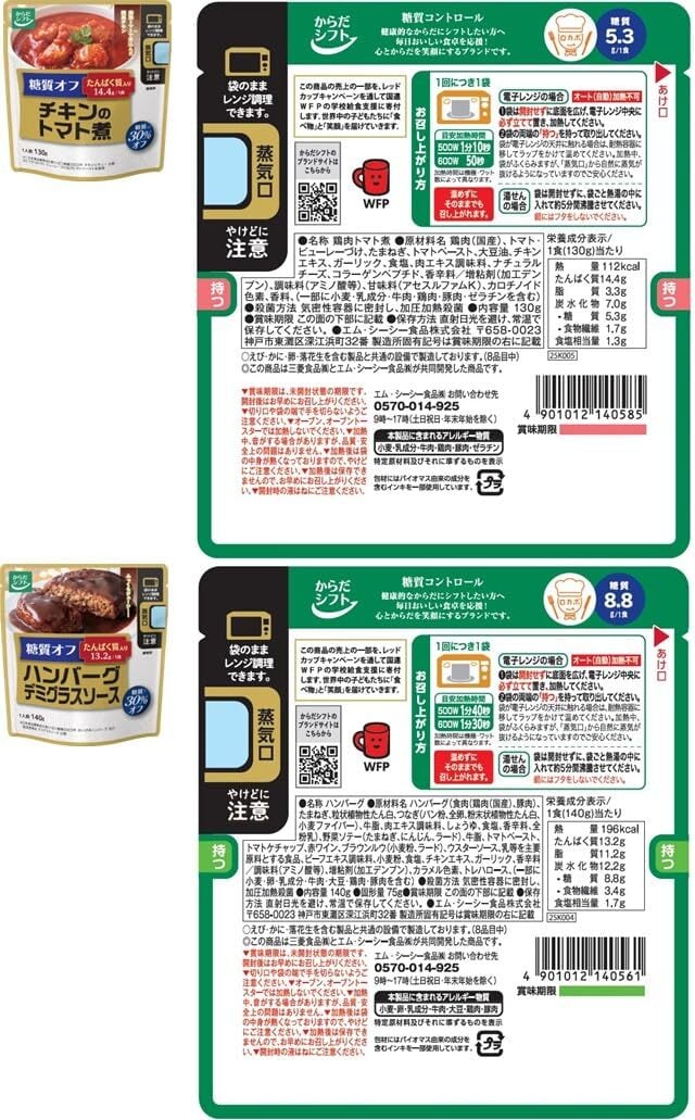 チキンのトマト煮:鶏肉(国産)、トマト・ピューレーづけ、たまねぎ、トマトペースト、大豆油、チキンエキス、ガーリック、食塩、肉エキス調味料、ナチュラルチーズ、コラーゲンペプチド、香辛料/増粘剤(加工デンプン)、調味料(アミノ酸等)、甘味料(アセスルファムK)、カロチノイド色素、香料、(一部に小麦・乳成分・牛肉・鶏肉・豚肉・ゼラチンを含む) ハンバーグデミグラスソース:ハンバーグ(食肉(鶏肉(国産)、豚肉)、たまねぎ、粒状植物性たん白、つなぎ(パン粉、全卵、粉末状植物性たん白、小麦ファイバー)、牛脂、肉エキス調味料、しょうゆ、食塩、香辛料、全粉乳)、野菜ソテー(たまねぎ、にんじん、ラード)、牛脂、トマトペースト、トマトケチャップ、赤ワイン、ブラウンルウ(小麦粉、ラード)、ウスターソース、乳等を主要原料とする食品、ビーフエキス調味料、小麦粉、食塩、チキンエキス、ガーリック、香辛料/調味料(アミノ酸等)、増粘剤(加工デンプン)、カラメル色素、トレハロース、(一部に小麦・卵・乳成分・牛肉・大豆・鶏肉・豚肉を含む)