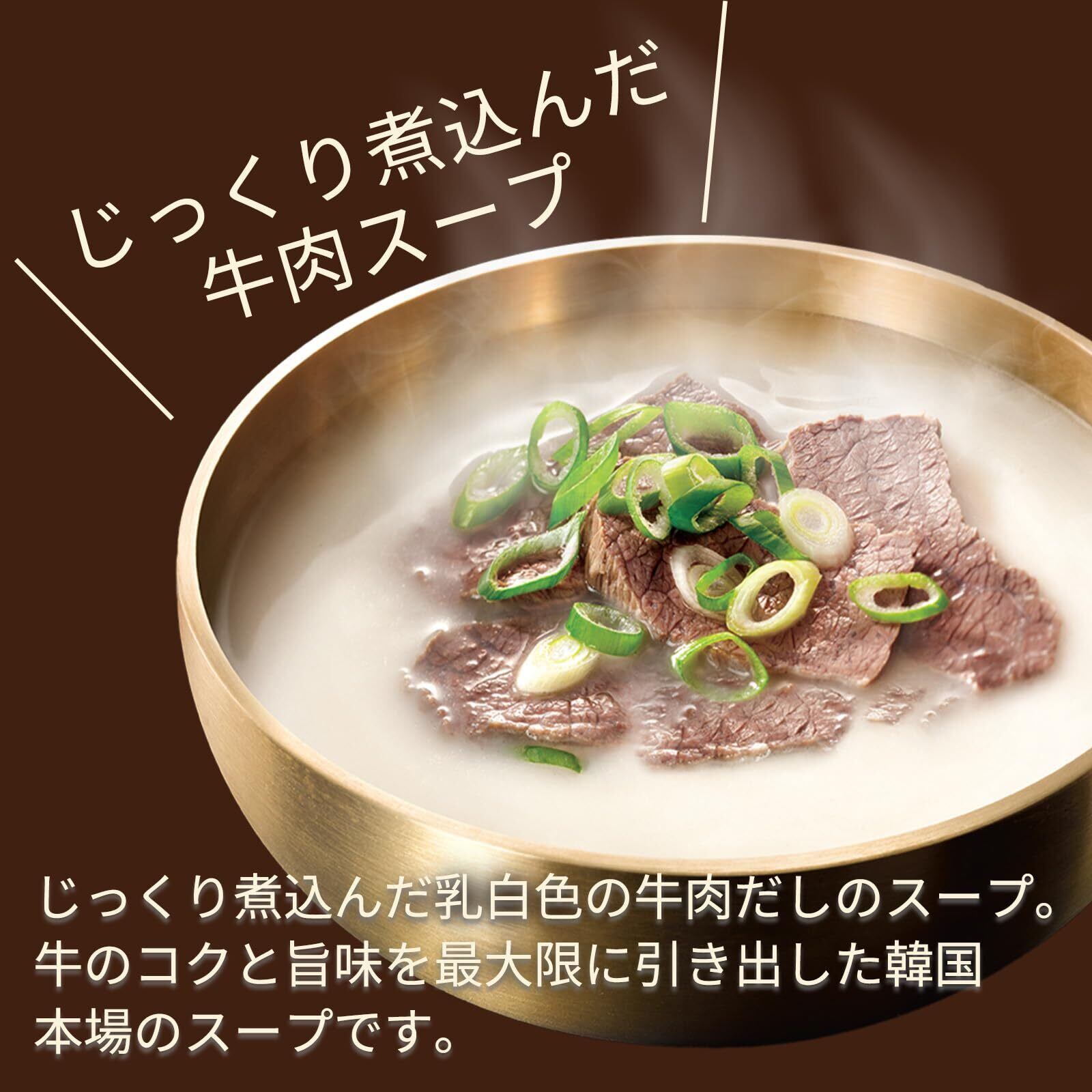 【ソルロンタン】牛肉、牛骨濃縮液(牛骨抽出液、食塩、牛脂)、牛肉濃縮液、牛肉だし、野菜エキス、食塩/調味料(アミノ酸等)、増粘剤(キサンタンガム)、香料、カラメル色素、pH調整剤、酸化防止剤(V.E)、(一部に小麦・牛肉・大豆・鶏肉を含む)