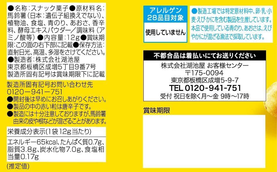 馬鈴薯(日本:遺伝子組換えでない)、植物油、食塩、青のり、あおさ、香辛料、酵母エキスパウダー/調味料(アミノ酸等)