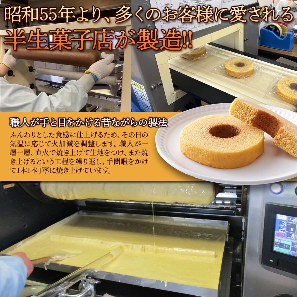 【美味しさのひみつ】ふんわりとした食感に仕上げるため、その日の気温に応じて火加減を調整します。職人が一層一層、直火で焼き上げて生地をつけ、また焼き上げるという工程を繰り返し、手間暇をかけて1本1本丁寧に焼き上げています。