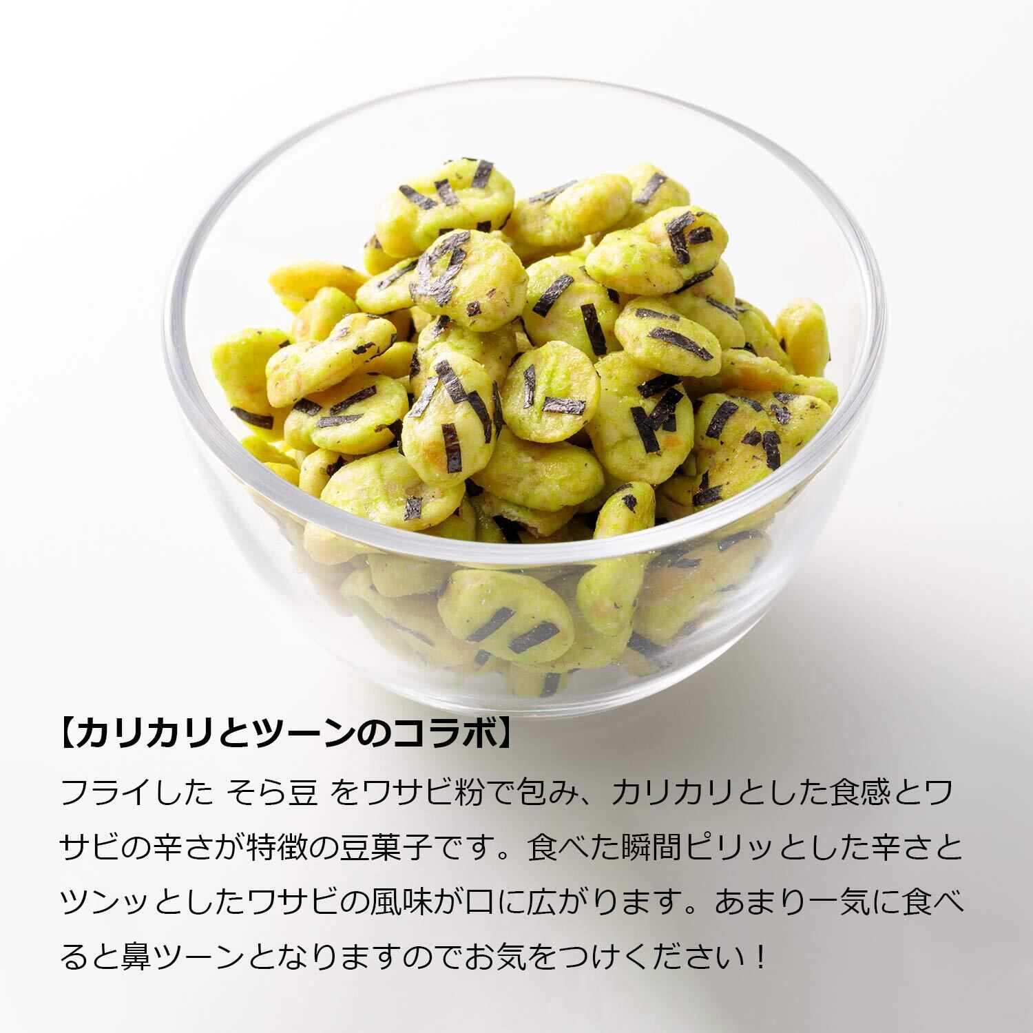 【カリカリとツーンのコラボ】フライしたそら豆をワサビ粉で包み、カリカリとした食感とワサビの辛さが特徴の豆菓子です。食べた瞬間ピリッとした辛さと、ツンッとしたワサビの風味が口に広がります。