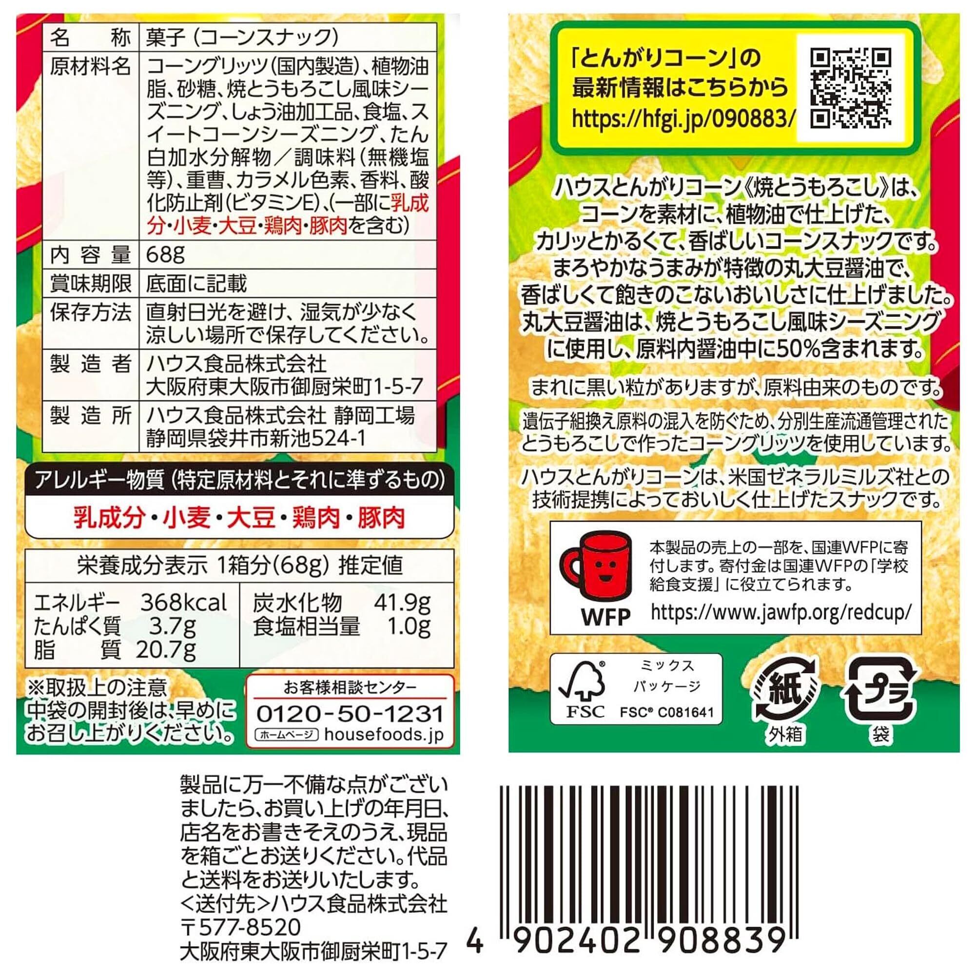 コーングリッツ(国内製造)、植物油脂、砂糖、焼とうもろこし風味シーズニング、しょう油加工品、食塩、スイートコーンシーズニング、たん白加水分解物/調味料(無機塩等)、重曹、カラメル色素、香料、酸化防止剤(ビタミンE)、(一部に乳成分・小麦・大豆・鶏肉・豚肉を含む)