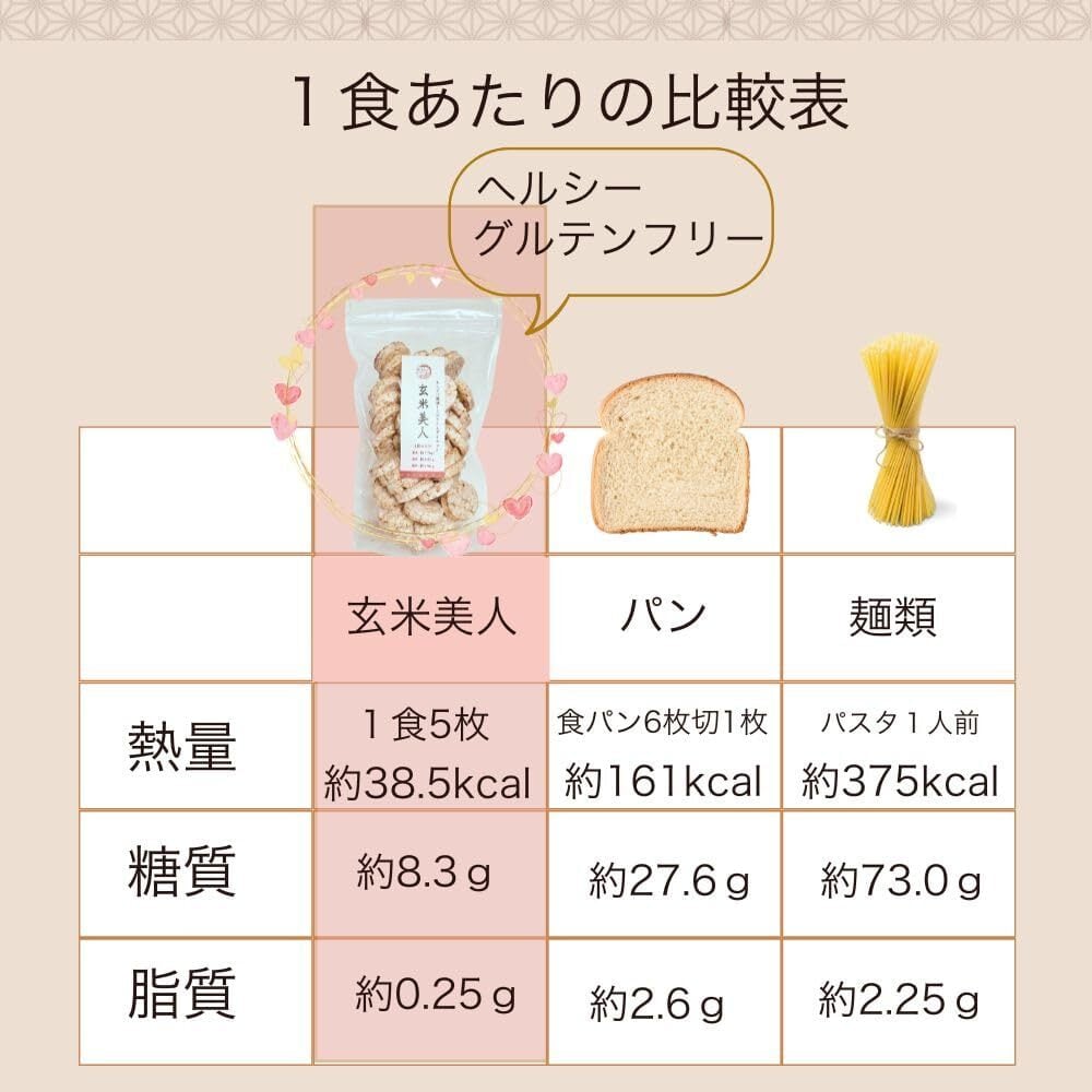 【罪悪感ない夜食・間食!】1枚たったの7.7kcalしかなく脂質も少ないため、お菓子や菓子パンと比べて圧倒的に低カロリー!どうしても何か口に入れたい時の間食や、遅い時間帯の夕食、夜食が必要な時に最適な玄米美人。