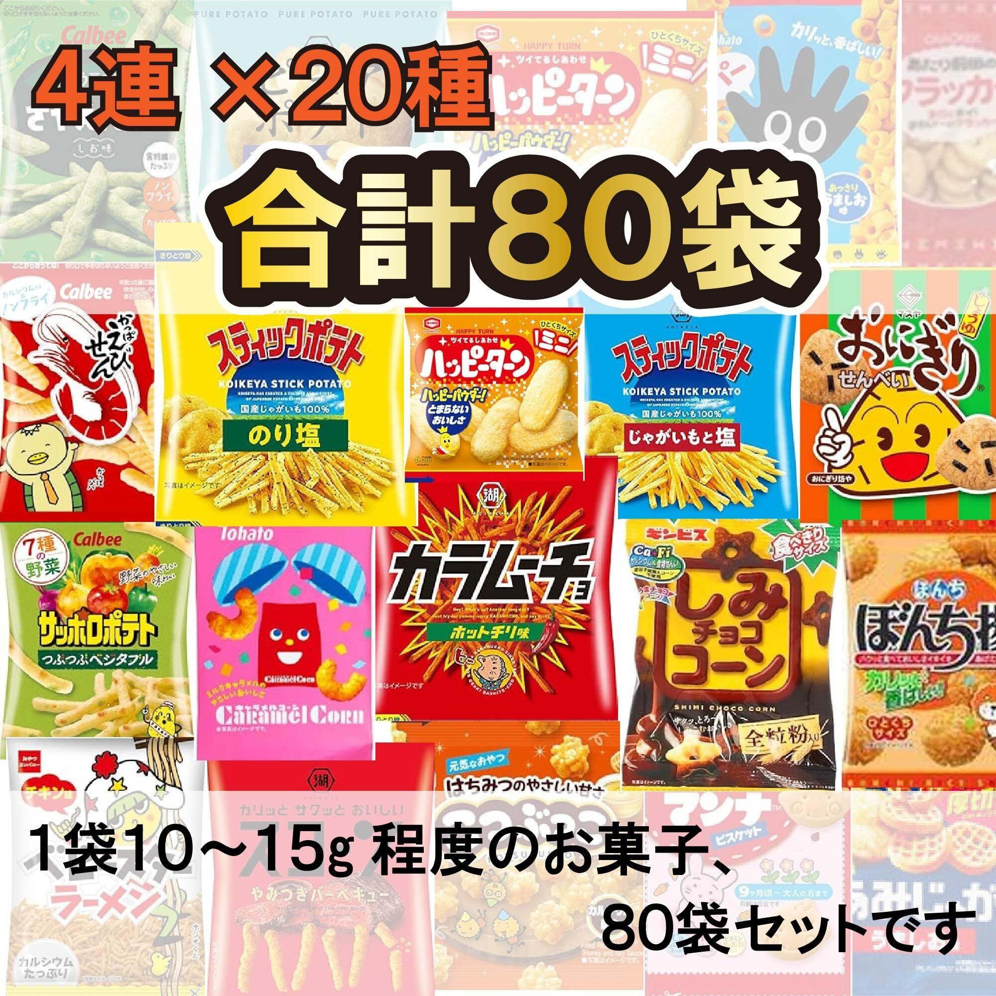 吊り下げ4連お菓子(ミニスナック菓子 4袋)が20種類入ったアソートセットです。 人気のお菓子を詰合せしました。少量ずつ小分けされていますので、食べ比べやお子様のおやつにいかがでしょうか。 【衛生的】1枚ずつ個包装されており、食べる分だけ開封できるので、湿気や酸化による劣化を防ぐことができます。賞味期限も小袋ごとに記載されています。 【持ち運びに便利】小分けなので、バッグに好きな分だけ入れて、外出先で食べたいときにすぐ食べることができます。 【分けやすい・配りやすい】家族や友人、職場などで差し入れなど簡単にシェアできるので、ばらまきにもおすすめです。イベントやお土産にも最適! 【プレゼントやイベントに】クリスマス、ハロウィン、こどもの日、お祭り、誕生日、プレゼント、景品、その他、各種イベント、催し物などでご利用いただけます。 【セット内容】かっぱえびせん12g×4 、サッポロポテト つぶつぶベジタブル9g×4 、さやえんどう しお味12g×4 、ベビースターいろいろ17g×4 、ひとくちカット GOLD STYLE 幸せの極みだし 食塩不使用12g×4 、ピュアポテト 厚切りひとくちカット オホーツクの塩と岩塩13g×4 、スティックポテト のり塩12g×4 、スティックカラムーチョ ホットチリ味12g×4 、やみつきバーベキュー15g×4 、キャラメルコーン10g×4 、こつぶポテコ うましお味14g×4 、ミニあみじゃが うましお味11g×4 、ハッピーターンミニ15g×4 、こつぶっこ15g×4 、しみチョココーン全粒粉13g×4 、前田のクラッカー15g×4 、ぼんち揚17g×4 、おにぎりせんべい14g×4 、ミニたべっ子どうぶつ メープルバター味 4連14g×4 、スティックポテト じゃがいもと塩12g×4(スナック菓子を中心に取り揃えておりますが、メーカー様の在庫の関係で一部変更になる場合がございます。)