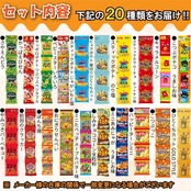 吊り下げ4連お菓子(ミニスナック菓子 4袋)が20種類入ったアソートセットです。 人気のお菓子を詰合せしました。少量ずつ小分けされていますので、食べ比べやお子様のおやつにいかがでしょうか。
