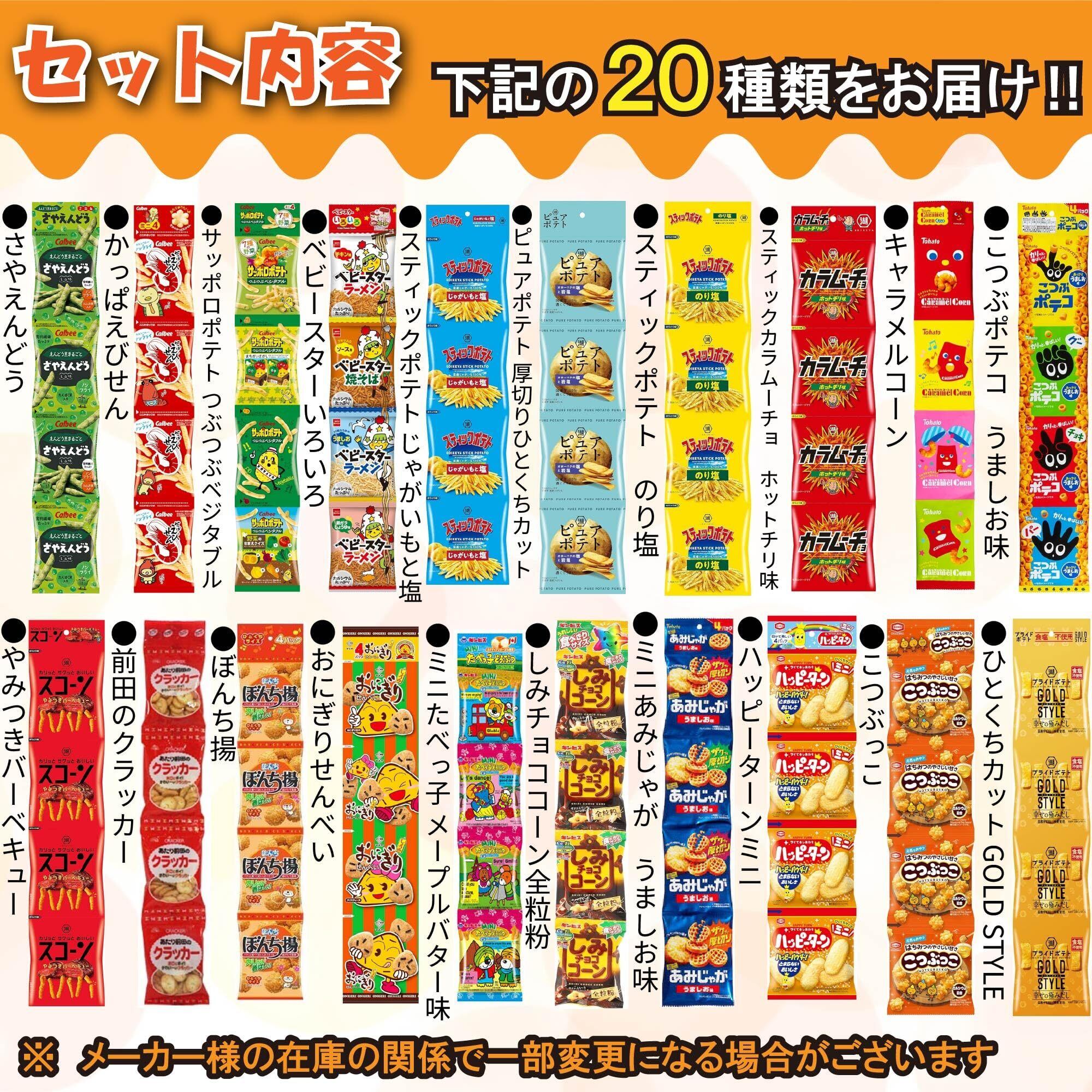 【セット内容】かっぱえびせん12g×4 、サッポロポテト つぶつぶベジタブル9g×4 、さやえんどう しお味12g×4 、ベビースターいろいろ17g×4 、ひとくちカット GOLD STYLE 幸せの極みだし 食塩不使用12g×4 、ピュアポテト 厚切りひとくちカット オホーツクの塩と岩塩13g×4 、スティックポテト のり塩12g×4 、スティックカラムーチョ ホットチリ味12g×4 、やみつきバーベキュー15g×4 、キャラメルコーン10g×4 、こつぶポテコ うましお味14g×4 、ミニあみじゃが うましお味11g×4 、ハッピーターンミニ15g×4 、こつぶっこ15g×4 、しみチョココーン全粒粉13g×4 、前田のクラッカー15g×4 、ぼんち揚17g×4 、おにぎりせんべい14g×4 、ミニたべっ子どうぶつ メープルバター味 4連14g×4 、スティックポテト じゃがいもと塩12g×4(スナック菓子を中心に取り揃えておりますが、メーカー様の在庫の関係で一部変更になる場合がございます。)