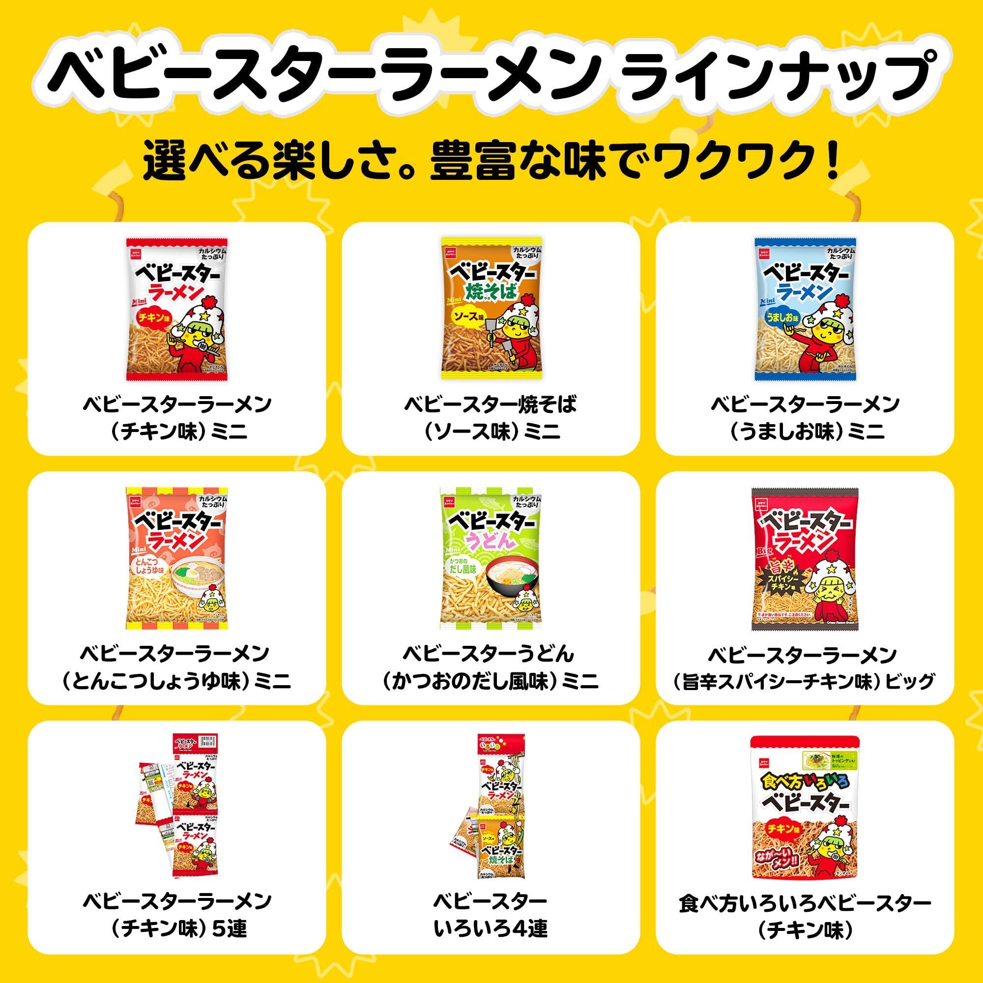 大人気ベビースターラーメンが5袋連なったタイプになります! ! 食べきりサイズのため、小分けにしてお召し上がりいただけます。パリッ、ポリッとした食感のベビースターラーメンのチキン味を存分にお楽しみください。日常のちょっとしたおつまみやお子様へのおやつに最適です! !