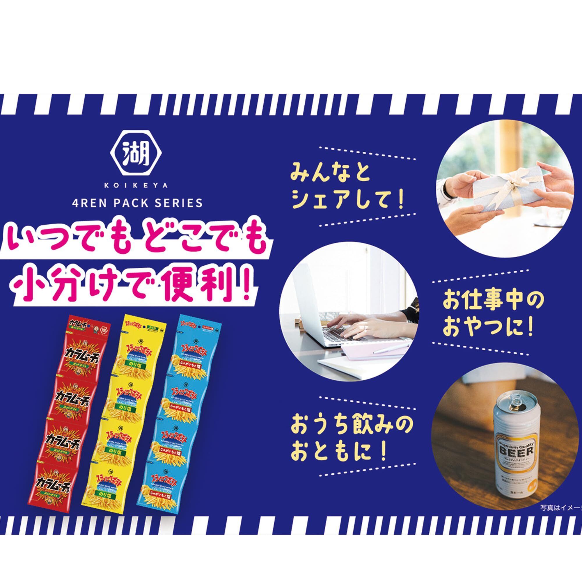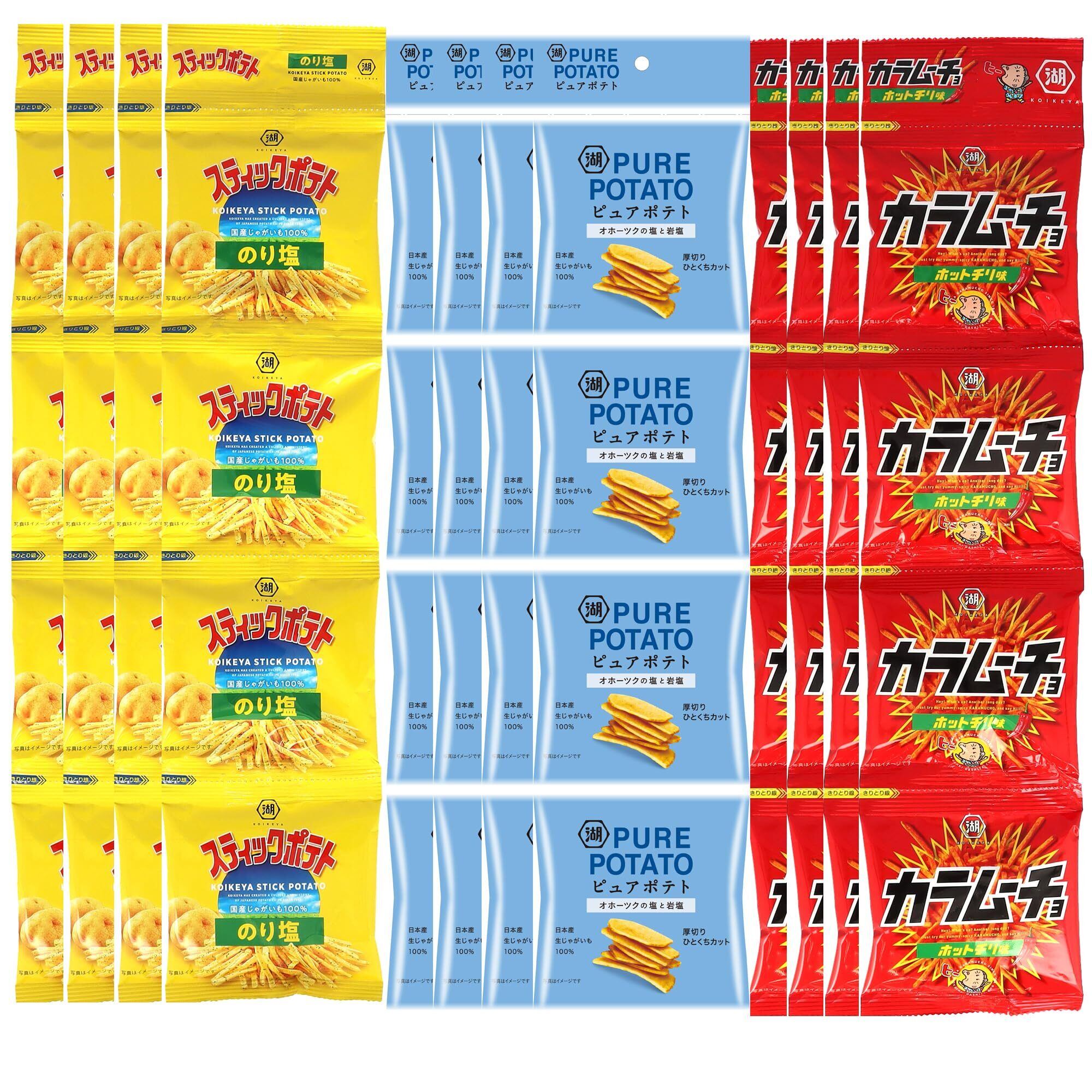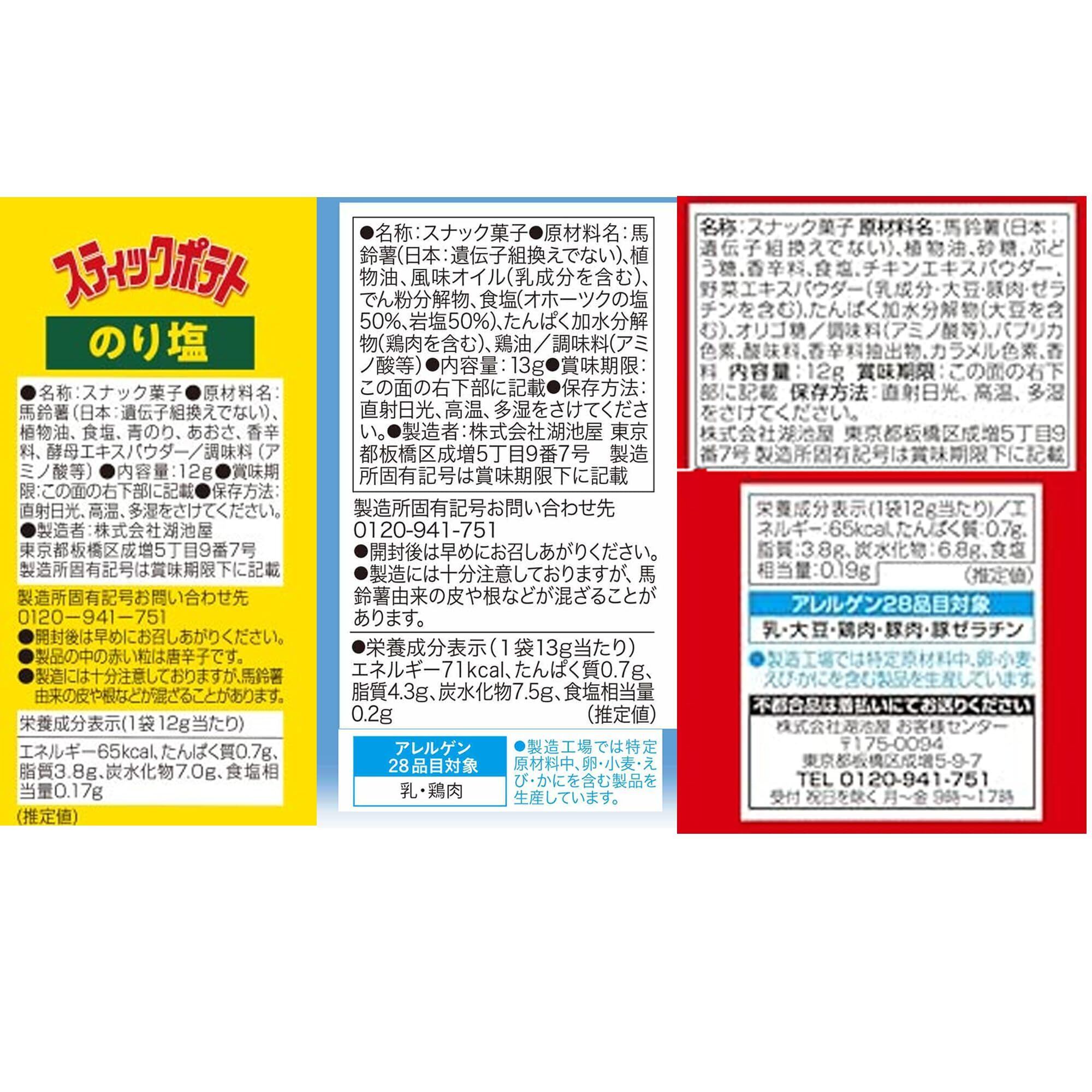 湖池屋の人気吊下げ菓子「スティックポテトのり塩」「スティックポテトじゃがいもと塩」「スティックカラムーチョホットチリ味」の3種を各4袋、計12袋詰め合わせました。