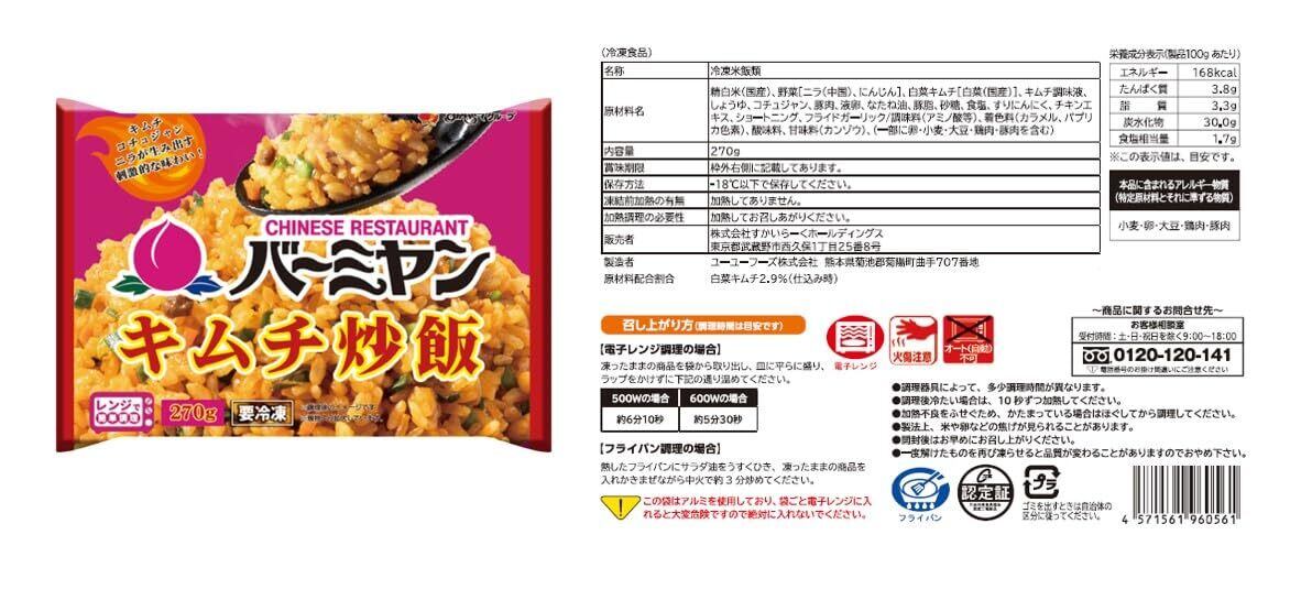 【バーミヤン本格炒飯】米(国産)、液卵、焼豚、かに風味かまぼこ、みりん、ねぎ、ショートニング、食塩、しょうゆ、還元水あめ、ウスターソース、でん粉、ほたて貝エキス、オイスターソース、しょうがペースト、中華調味料、香辛料、ぶどう糖、いため油(なたね油、こめ油)/調味料(アミノ酸等)、加工でん粉、着色料(カラメル、紅麹、カロチノイド)、甘味料(カンゾウ、ステビア)、酸味料、貝Ca、(一部に小麦・卵・乳成分・ごま・大豆・鶏肉・豚肉を含む) 【スパイシーメキシカンピラフ】精白米(国産)、野菜(たまねぎ、とうもろこし、ピーマン)、鶏肉、調味香辛料(香辛料、食塩、砂糖)、なたね油、トマトペースト、ラード、チキンブイヨン、食塩、ミルポワパウダー、チキンエキス、ショートニング/カラメル色素、調味料(アミノ酸等)、酸味料、香料、(一部に小麦・乳成分・大豆・鶏肉・豚肉・ごまを含む) 【バーミヤンキムチ炒飯】精白米(国産)、野菜[ニラ(中国)、にんじん]、白菜キムチ[白菜(国産)]、キムチ調味液、しょうゆ、コチュジャン、豚肉、液卵、なたね油、豚脂、砂糖、食塩、すりにんにく、チキンエキス、ショートニング、フライドガーリック/調味料(アミノ酸等)、着色料(カラメル、パプリカ色素)、酸味料、甘味料(カンゾウ)、(一部に卵・小麦・大豆・鶏肉・豚肉を含む)