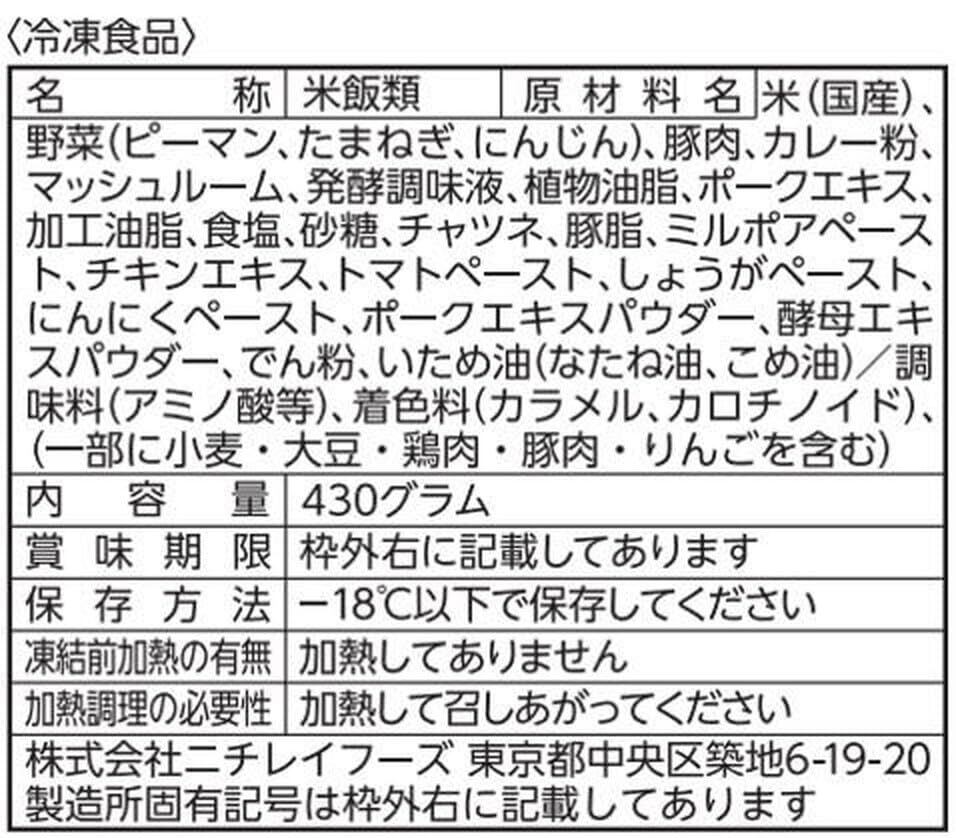 米(国産)、野菜(たまねぎ、にんじん、ピーマン)、豚肉、マッシュルーム、カレー粉、発酵調味液、植物油脂、ポークエキス、食塩、ショートニング、チャツネ、豚脂、砂糖、ミルポワペースト、チキンエキス、しょうがペースト、トマトペースト、にんにくペースト、ポークエキスパウダー、酵母エキスパウダー、でん粉、いため油(なたね油、こめ油)/調味料(アミノ酸等)、着色料(カラメル、カロチノイド)、(一部に小麦・大豆・鶏肉・豚肉・りんごを含む)
