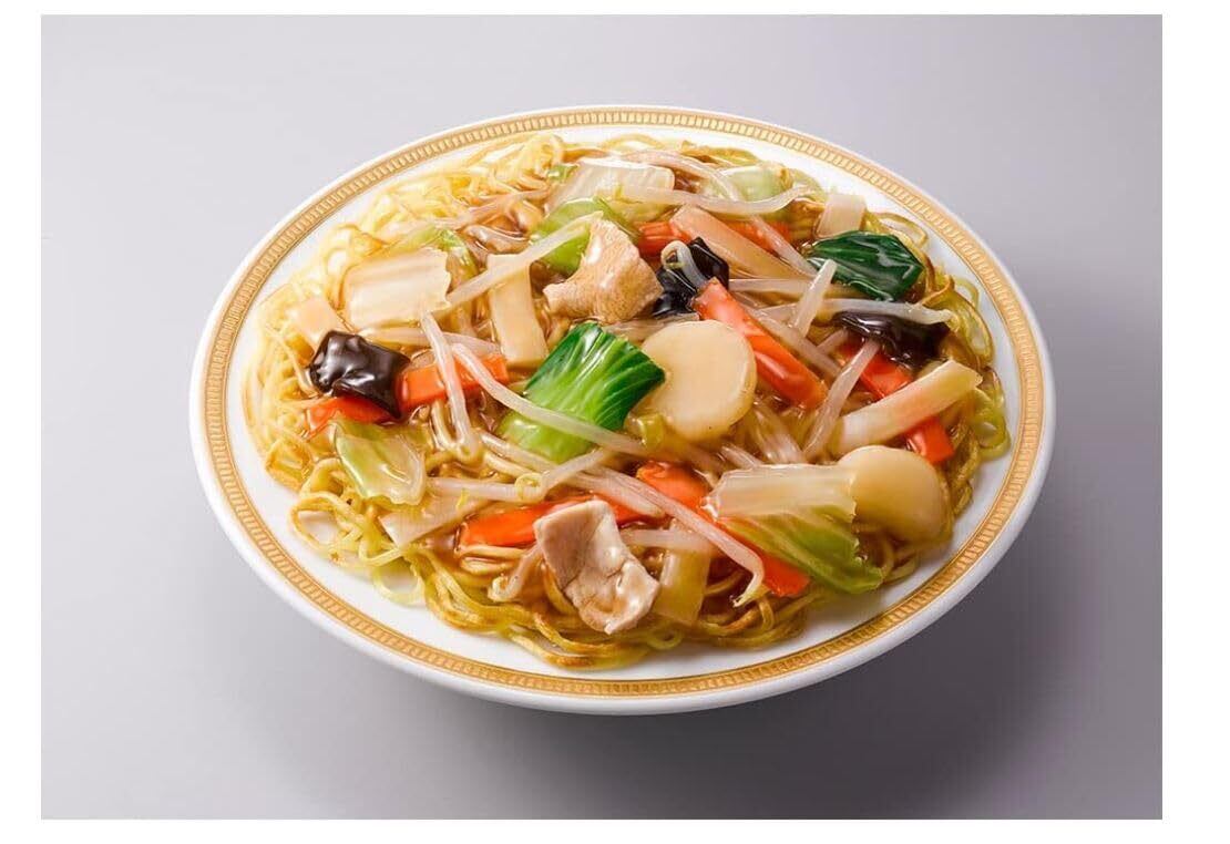 具入りあん〔野菜(もやし、白菜、チンゲン菜、水くわい、にんじん、たけのこ、ねぎ、しょうが)、豚肉、きくらげ、植物油脂、しょうゆ、砂糖、オイスターソース、エキス(ポーク、チキン)、たん白加水分解物、発酵調味料、鶏がらスープ、シーズニングオイル、にんにくペースト、食塩、こしょう/ 増粘剤(加工でん粉、キサンタン)、調味料(アミノ酸等)、カラメル色素〕、めん〔小麦粉(国内製造)、異性化液糖、大豆油、食塩、卵白粉/ かんすい、カロチノイド色素〕、いため油(なたね油)、(一部に小麦・卵・乳成分・ごま・大豆・鶏肉・豚肉を含む)