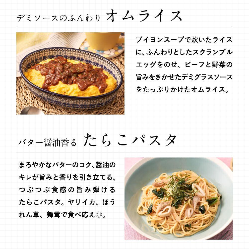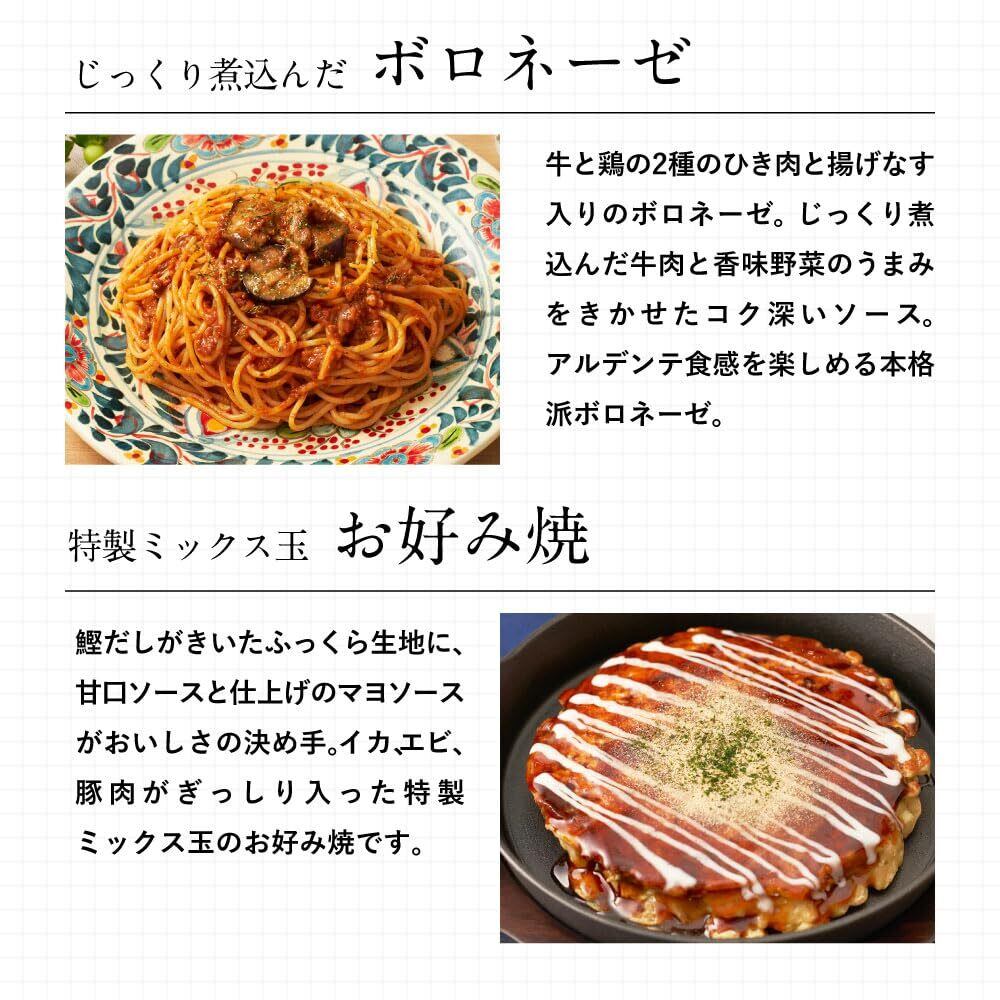 冷凍完全メシ人気のメニュー「かつ丼」「たらこパスタ」「ボロネーゼ」「デミオムライス」「お好み焼 特製ミックス玉」の5種類のメニューを1食ずつ 計5食お届け!