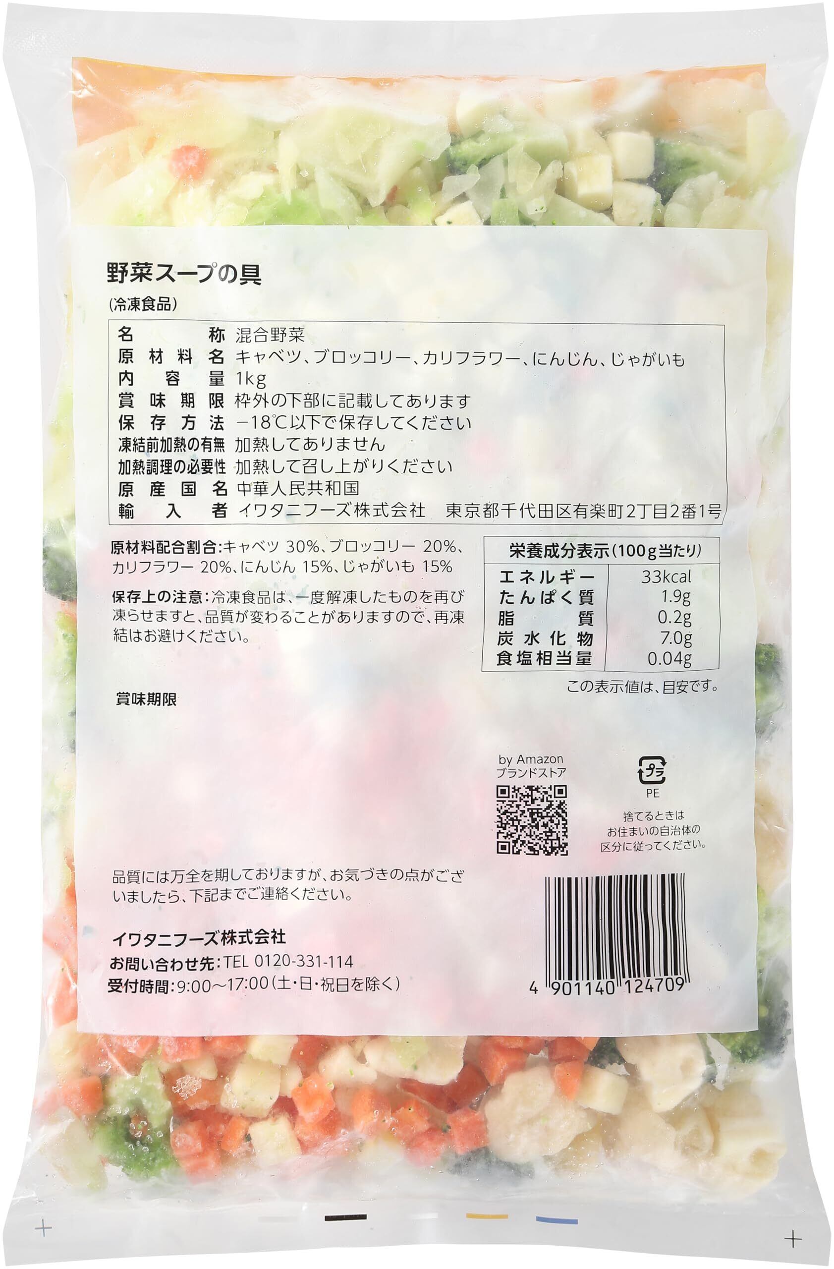 by 冷凍野菜スープの具は旬の時期に収穫されたキャベツ、ブロッコリー、カリフラワー、にんじん、じゃがいもをミックスして冷凍しています。コンソメスープやミネストローネにご利用いただけます。 1. IQF凍結なので、使いたい分だけを取り出してご利用いただけます。 2. 1kgの大容量 3. 旬の時期に収穫された色鮮やかな原料を、軽く湯通しして冷凍しています。 4. 指定の契約農場で栽培された原料を使用しており、産地から一貫した管理を行っております。