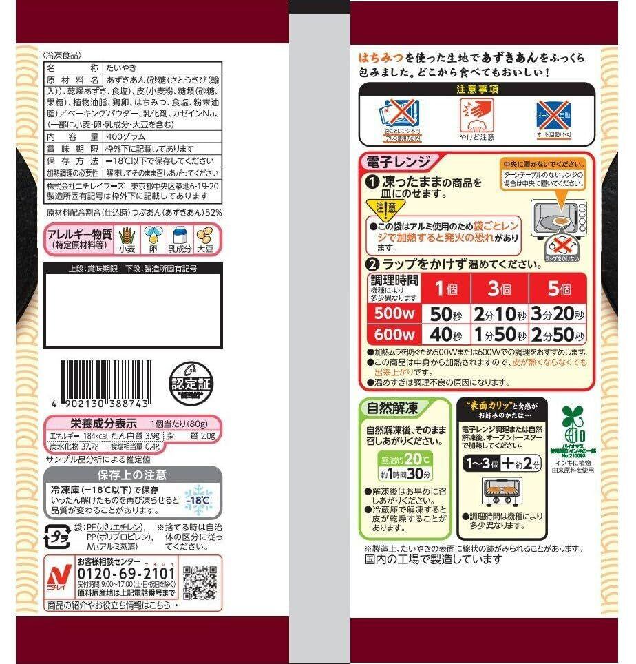 どこから食べても、あずきあんに当たるよう、頭から尻尾までしっかり詰まったたいやきです。おいしさの詰まった煮汁をあずきにしっかり吸わせ、あずき本来の香りや色(藤むらさき色)を引き出しました! あ電子レンジ調理のあとにオーブントースターで加熱すると、皮がパリッと! さらにおいしく召し上がれます。