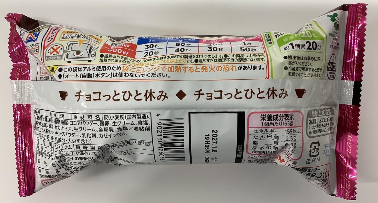 皮(小麦粉(国内製造)、糖類(砂糖、果糖)、植物油脂、ココアパウダー、鶏卵、生クリーム、食塩、粉末油脂)、砂糖、カカオマス、生クリーム、全粉乳、食塩/増粘剤(加工でん粉)、ベーキングパウダー、乳化剤、カゼインNa、(一部に小麦・卵・乳成分・大豆を含む)