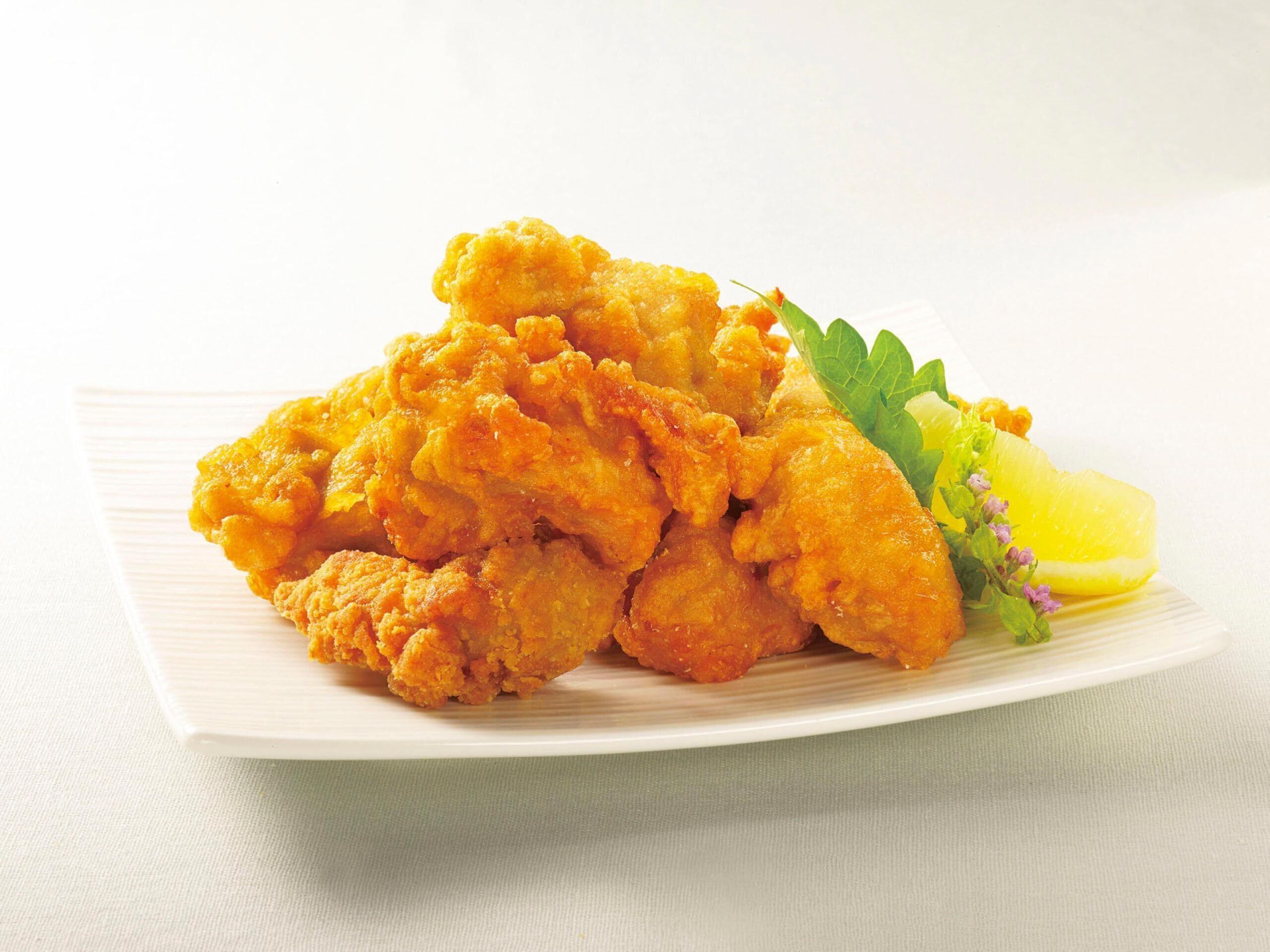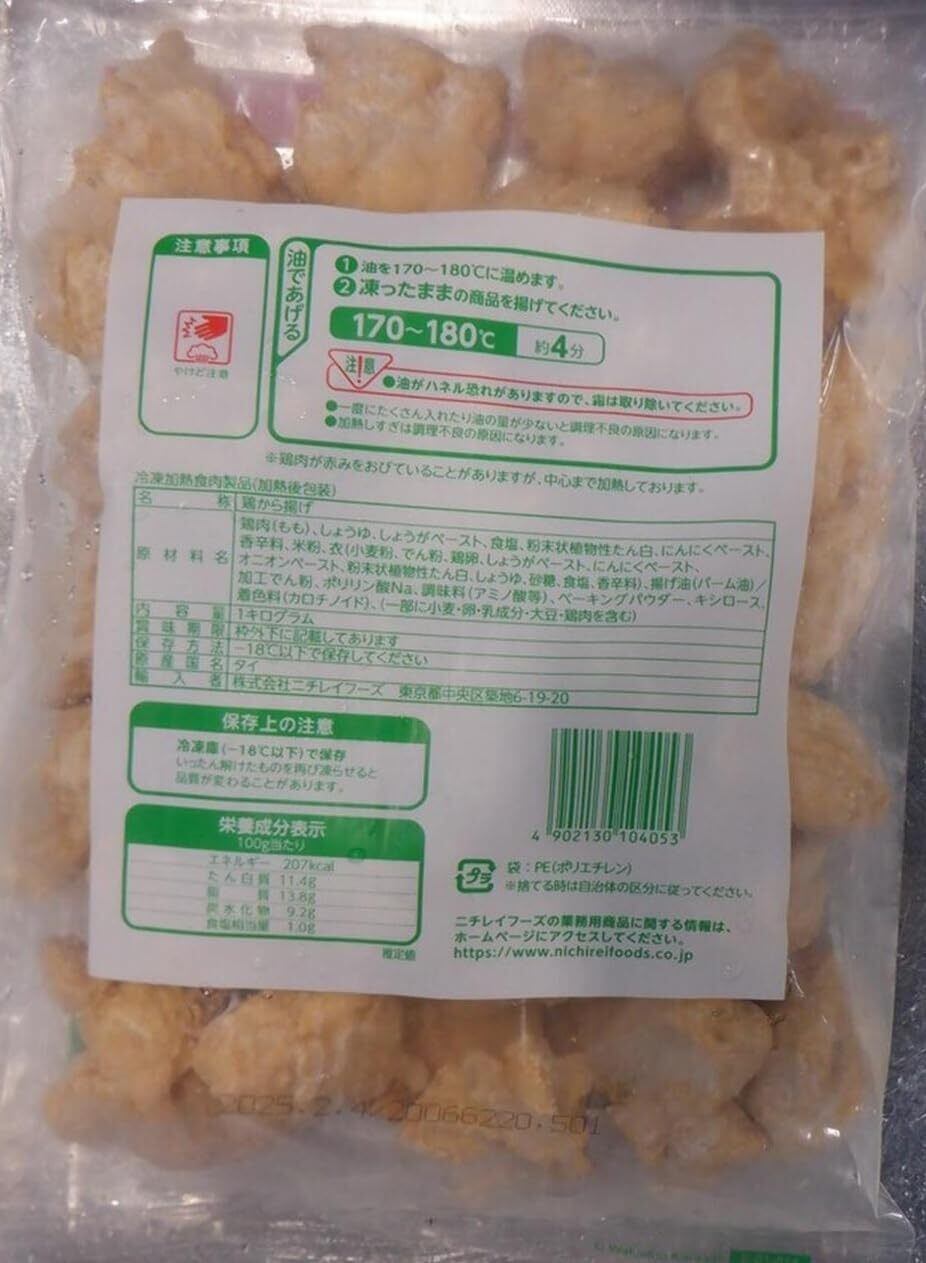 鶏肉(もも)、しょうゆ、しょうがペースト、食塩、粉末状植物性たん白、にんにくペースト、香辛料、米粉、衣(小麦粉、でん粉、鶏卵、しょうがペースト、にんにくペースト、オニオンペースト、粉末状植物性たん白、しょうゆ、砂糖、食塩、香辛料)、揚げ油(パーム油)/加工でん粉、ポリリン酸Na、調味料(アミノ酸等)、ベーキングパウダー、キシロース、着色料(カロチノイド)、(一部に小麦・卵・乳成分・大豆・鶏肉を含む)