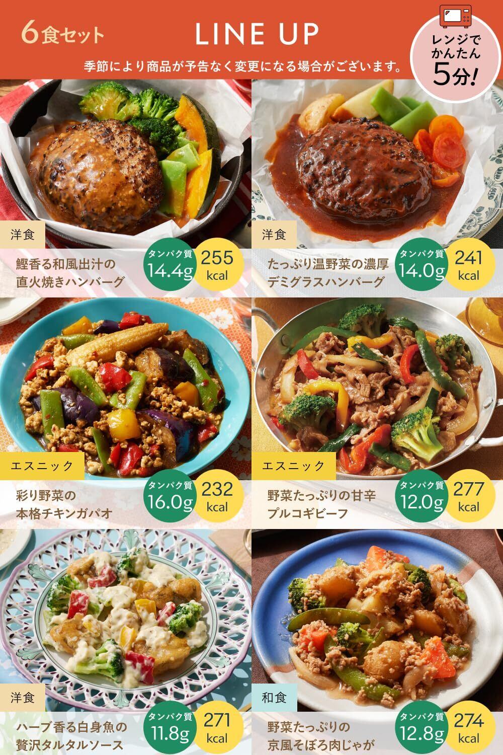 【商品詳細】おかずデリ6種 6食入。鰹香る和風出汁の直火焼きハンバーグ:255kcal, 彩り野菜の本格チキンガパオ:232kcal, ハーブ香る白身魚の贅沢タルタルソース:271kcal, 野菜たっぷりの京風そぼろ肉じゃが:274kcal, 野菜たっぷりの甘辛プルコギビーフ:277kcal, たっぷり温野菜の濃厚デミグラスハンバーグ:241kcal。 賞味期限:製造日から179日。出荷時から1ヶ月以上。保存方法:要冷凍(-18℃以下)。