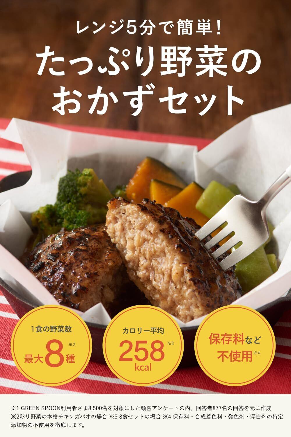 GREEN SPOONの人気メインディッシュ4種を集めた、ミールキット4食セットです。最大8種類の野菜を含む贅沢なおかず ゴロゴロ野菜たっぷり。累計120種類以上の食材からこだわって自社で選定した野菜をふんだんに使っております。一食300g以上のボリューム 一般的な冷凍ミールキットは約180gですが、GREEN SPOONのミールキットは出来上がりが300g以上!一食になる、満足感のあるボリュームです。 管理栄養士監修で栄養バランス◎ おいしさと栄養へのこだわりとして、カラダに良い栄養の組み合わせを管理栄養士がとことん考え抜き、オリジナルレシピで作っております。保存料、甘味料、合成着色料、発色剤は使わず、小さいお子様からご年配のかたまで幅広くお楽しみいただけます。レンジ5分で完成する簡単ステップで袋を耐熱容器に移し、レンジで5分温めるだけで完成します。レシピを考えたり、食材を切ったりと調理をする手間なく、ラクに栄養のある一食をお召し上がりいただけます。在宅中のランチに。夜遅くなった日のヘルシーな罪悪感のない夜ごはんに。食べ過ぎた翌日のリセットのお助けアイテムとして。様々なシーンでご利用いただけます。 おいしくて、簡単で、ヘルシーで、たのしい。 そんなワクワクする野菜たっぷりの一食が、あなたの生活のすぐそこにいつもありますように。