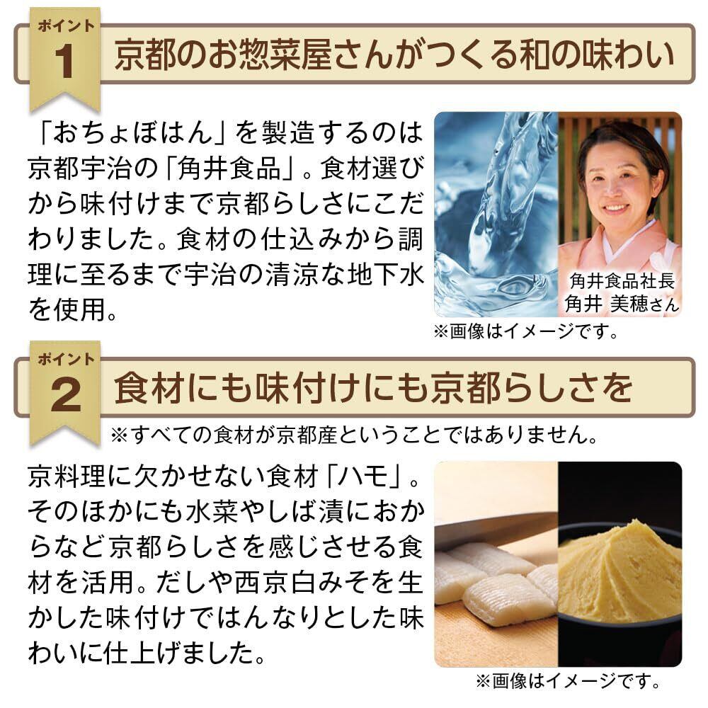 【京都のお惣菜屋さんがつくる和の味わい】「おちょぼはん」を製造するのは京都宇治の「角井食品」。食材選びから味付けまで京都らしさにこだわり、食材の仕込みから調理に至るまで、宇治の清涼な地下水を使用しています。