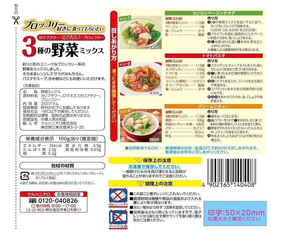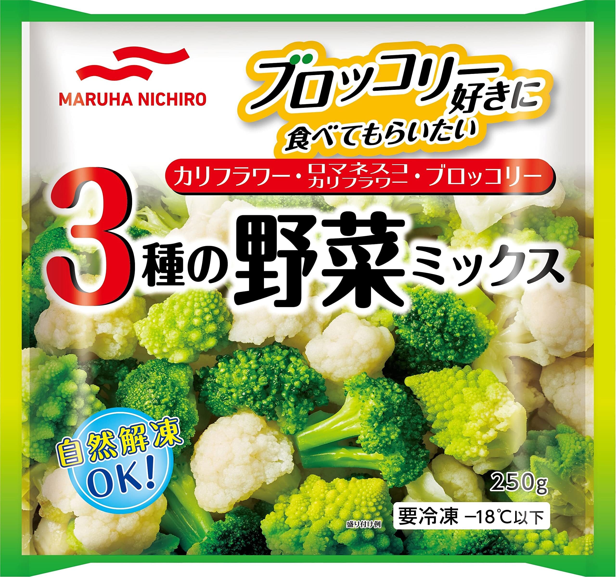マルハニチロの冷凍食品の商品です。ブロッコリー(緑)、カリフラワー(白)、ロマネスコカリフラワー(黄緑)と、3種類の彩りきれいな野菜ミックスです。栄養たっぷりのブロッコリーと食感や見た目も楽しいロマネスコ、カリフラワーが入ってます。スープやシチューの具材、ホットサラダなど、様々な料理にお使いいただけます。また、自然解凍も可能ですので忙しいお弁当作りに簡単に彩りを加えられるのもうれしい商品です。