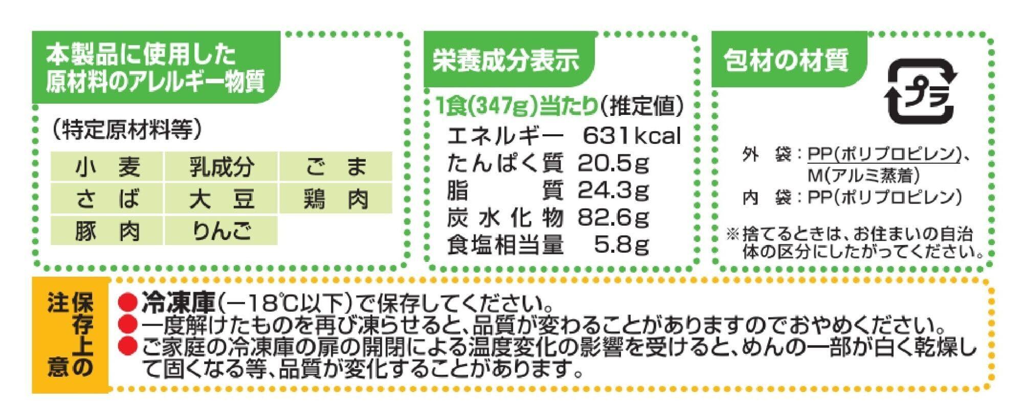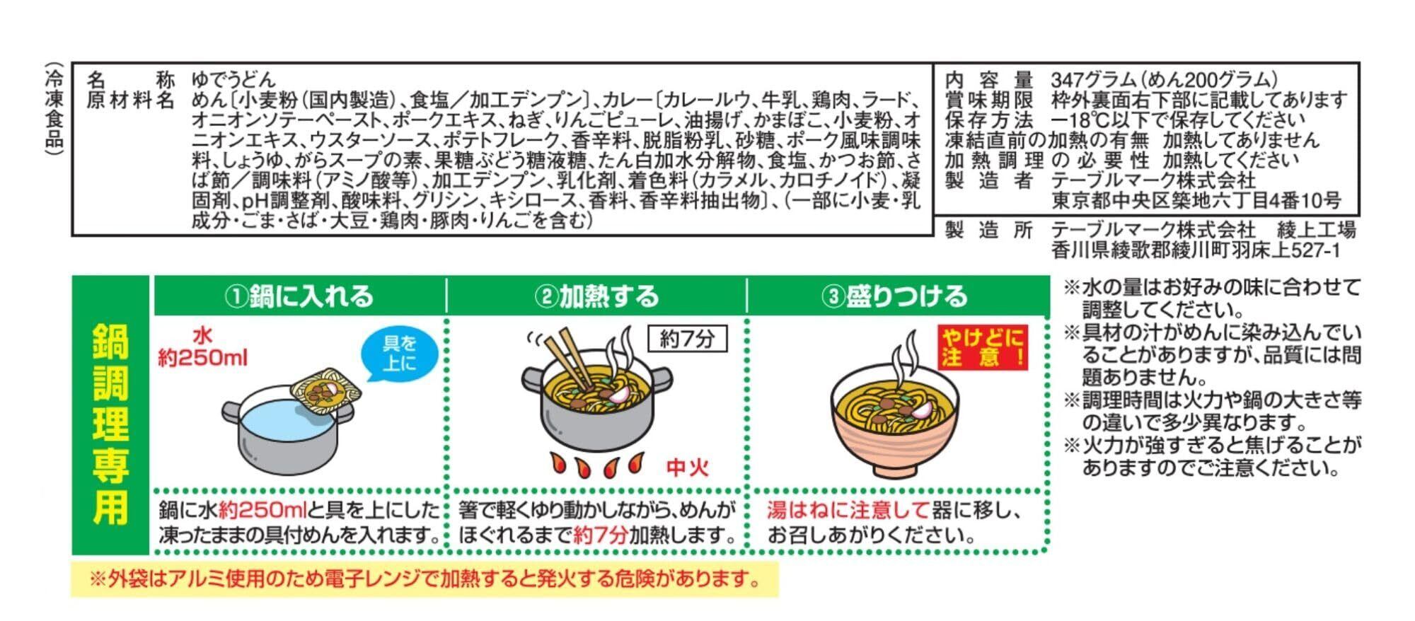 めん〔小麦粉(国内製造)、食塩/加工デンプン〕、カレー〔カレールウ、牛乳、鶏肉、ラード、オニオンソテーペースト、ポークエキス、ねぎ、りんごピューレ、油揚げ、かまぼこ、小麦粉、オニオンエキス、ウスターソース、ポテトフレーク、香辛料、脱脂粉乳、砂糖、ポーク風味調味料、しょうゆ、がらスープの素、果糖ぶどう糖液糖、たん白加水分解物、食塩、かつお節、さば節/調味料(アミノ酸等)、加工デンプン、乳化剤、着色料(カラメル、カロチノイド)、凝固剤、pH調整剤、酸味料、グリシン、キシロース、香料、香辛料抽出物〕、(一部に小麦・乳成分・ごま・さば・大豆・鶏肉・豚肉・りんごを含む)