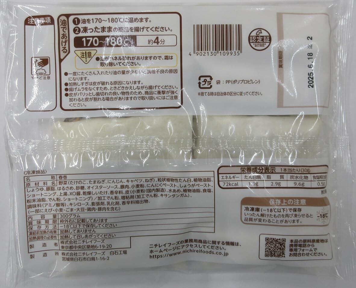 [冷凍] ニチレイ 業務用 (特)パリパリの春巻 300g(10本入)×6袋