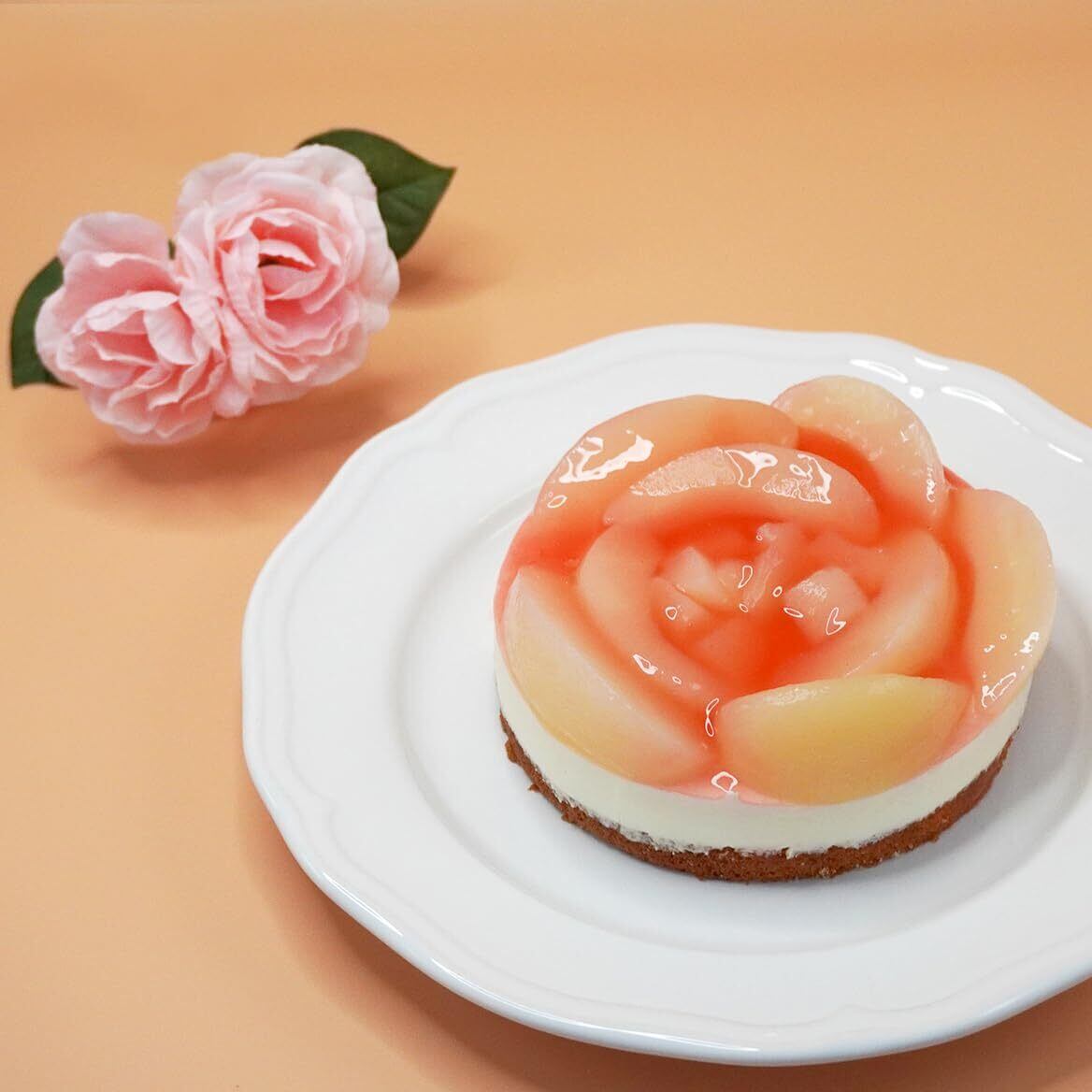 レアチーズ生地に、白桃をお花に見立てた華やかなケーキ。ギフトにぴったり。
