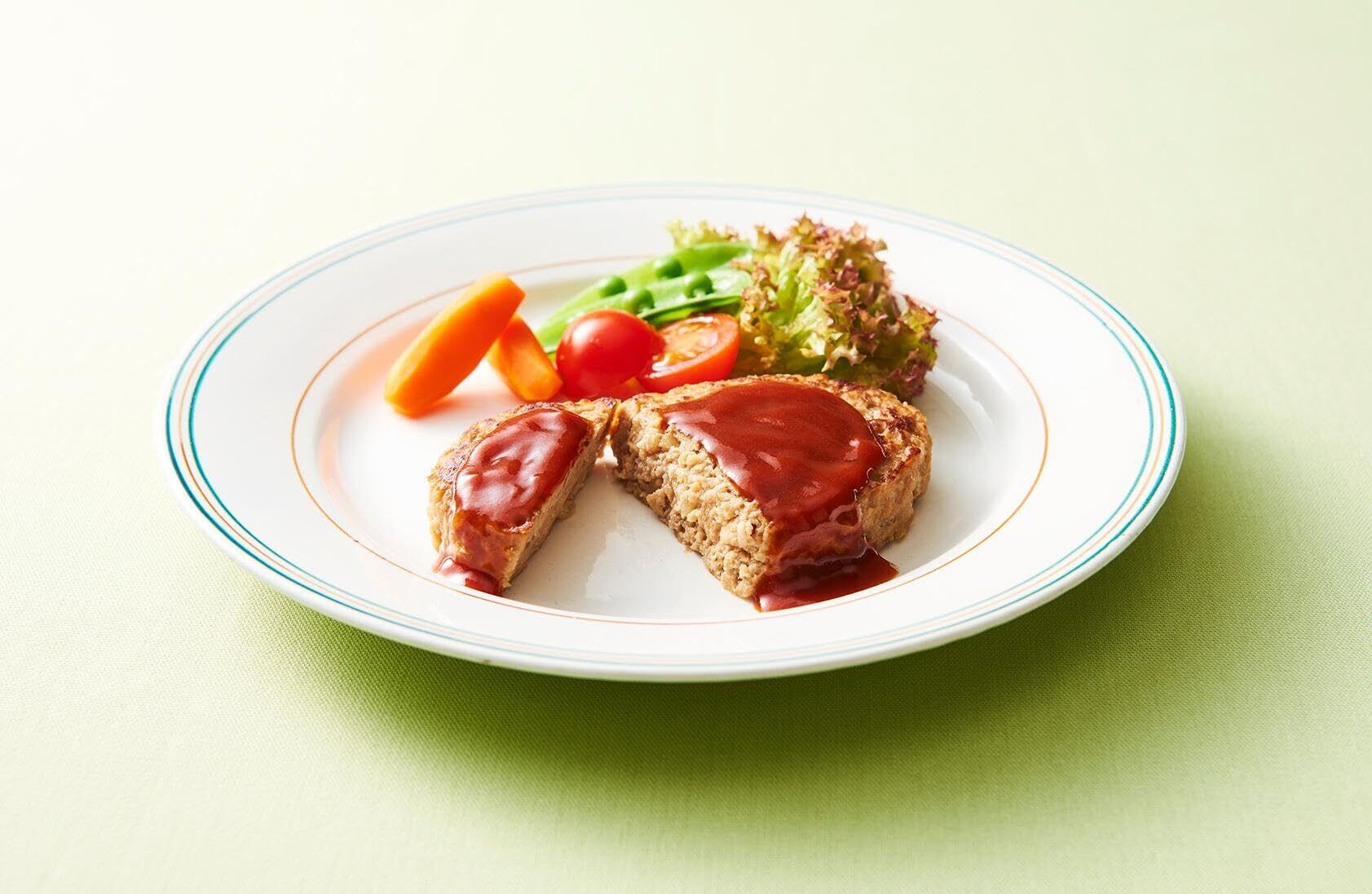●ニチレイフーズオリジナルの「安心逸品R」シリーズ●豚肉・鶏肉・たまねぎの主原料に関して国産原料を使用●ハンバーグは両面焼き製法にて肉汁を閉じ込め、蒸し焼き製法にてふっくらやわらかく。焼き条件を見直し、見た目においしく、豚脂を加え更にジューシーに●お子様に不足しがちなカルシウム、鉄分と食物繊維を添加●「安心逸品Rチキンブイヨン」を使用し、おいしさはそのままに、食塩相当量の値に配慮