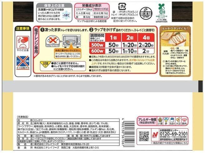豚肉(輸入)、たん白加水分解物、食塩、砂糖、粉末状植物性たん白、香辛料、衣(パン粉、でん粉、コーンフラワー、植物油脂、粉末卵白、小麦粉、卵殻粉、食塩、大豆粉末、香辛料、脱脂粉乳、粉末卵黄)、揚げ油(大豆油)/加工でん粉、調味料(有機酸等)、増粘剤(増粘多糖類、アルギン酸Na)、セルロース、乳化剤、焼成Ca、pH調整剤、着色料(カロチノイド)、(一部に小麦・卵・乳成分・大豆・豚肉を含む)