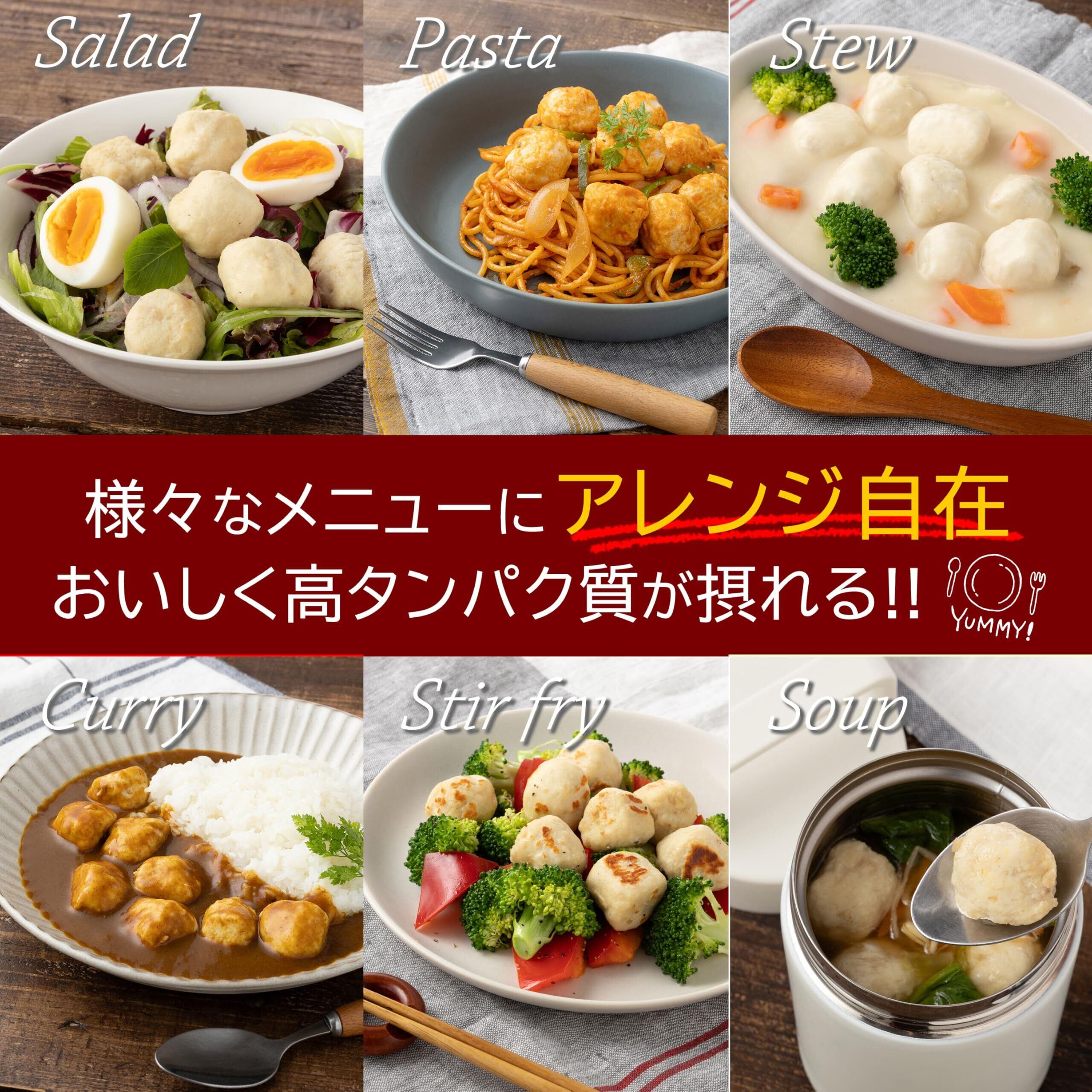 良質な鶏ムネ肉とホエイ・カゼイン・ソイプロテインを配合した高たんぱく肉だんごです。日々の生活の中で不足しがちなタンパク質を食事で美味しく補給できます。