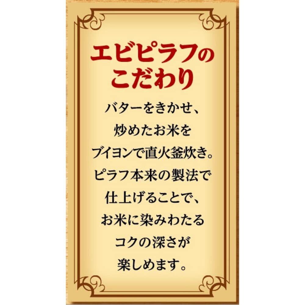 プリッとしたエビ、彩り野菜がしっかり入った、具だくさんなエビピラフです。バターをきかせ、炒めたお米を大きなお釜で直火でブイヨンで炊き上げ、パラッとふっくらしたごはんに仕上げました。お米の中まで味がしみ込んでおりますので後味までしっかり感じられます。彩り野菜を増量しました。