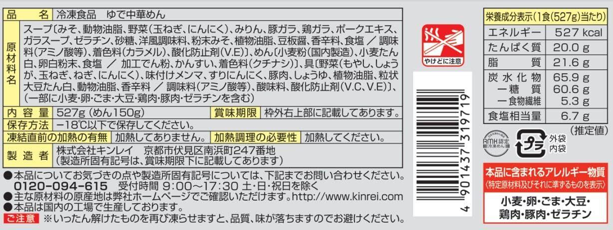 【スープ】みそ、動物油脂、野菜(玉ねぎ、にんにく)、みりん、豚ガラ、鶏ガラ、ポークエキス、ガラスープ、ゼラチン、砂糖、洋風調味料、粉末みそ、植物油脂、豆板醤、香辛料 / 調味料(アミノ酸等)、着色料(カラメル)、酸化防止剤(V.E)、【めん】小麦粉(国内製造)、小麦たん白、卵白粉末、食塩 / 加工でん粉、かんすい、着色料(クチナシ)、【具】野菜(もやし、しょうが、玉ねぎ、ねぎ、にんにく)、味付けメンマ、すりにんにく、豚肉、しょうゆ、植物油脂、粒状大豆たん白、動物油脂、香辛料 / 調味料(アミノ酸等)、酸味料、酸化防止剤(V.C)、(一部に小麦・卵・大豆・鶏肉・豚肉・ゼラチン・ごまを含む)