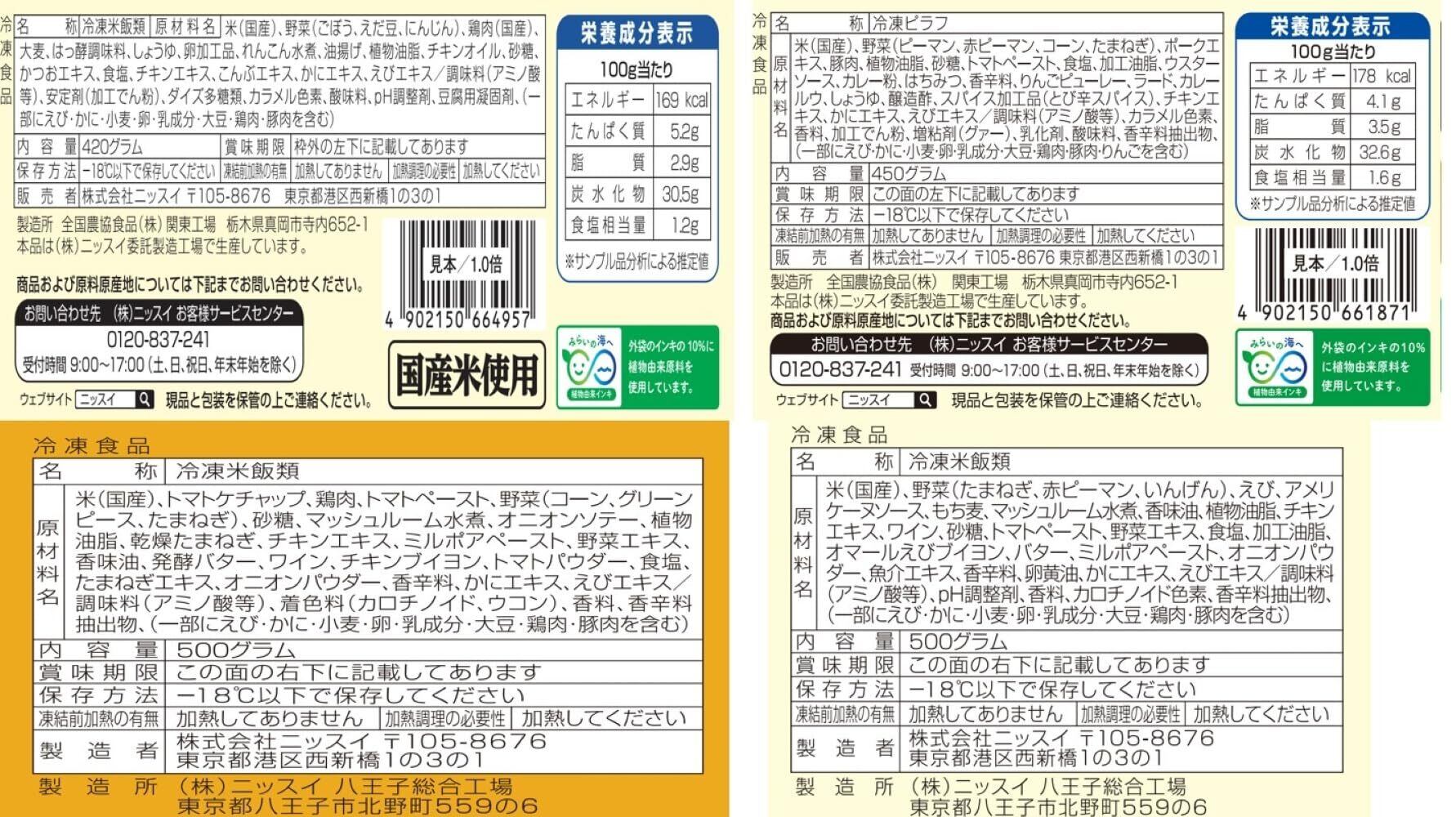 【鶏ごぼうごはん】米(国産)、野菜(ごぼう、えだ豆、にんじん)、鶏肉(国産)、大麦、はっ酵調味料、しょうゆ、卵加工品、れんこん水煮、 油揚げ、植物油脂、チキンオイル、砂糖、かつおエキス、食塩、チキンエキス、こんぶエキス、かにエキス、えびエキス/調味料(アミノ酸等)、安定剤(加工でん粉)、ダイズ多糖類、カラメル色素、酸味料、pH調整剤、豆腐用凝固剤、(一部にえび・かに・小麦・卵・乳成分・大豆・鶏肉・豚肉を含む)【カレーピラフ】米(国産)、野菜(ピーマン、赤ピーマン、コーン、たまねぎ)、ポークエキス、豚肉、植物油脂、砂糖、トマトペースト、食塩、加工油脂、ウスターソース、カレー粉、はちみつ、香辛料、りんごピューレー、ラード、カレールウ、しょうゆ、醸造酢、スパイス加工品(とび辛スパイス)、チキンエキス、かにエキス、えびエキス/調味料(アミノ酸等)、カラメル色素、香料、加工でん粉、増粘剤(グァー)、乳化剤、酸味料、香辛料抽出物、(一部にえび・かに・小麦・卵・乳成分・大豆・鶏肉・豚肉・りんごを含む)【海老ピラフ】米(国産)、野菜(たまねぎ、赤ピーマン、いんげん)、えび、アメリケーヌソース、もち麦、マッシュルーム水煮、香味油、植物油脂、チキンエキス、ワイン、砂糖、トマトペースト、野菜エキス、食塩、加工油脂、オマールえびブイヨン、バター、ミルポアペースト、オニオンパウダー、魚介エキス、香辛料、卵黄油、かにエキス、えびエキス/調味料(アミノ酸等)、pH調整剤、香料、カロチノイド色素、香辛料抽出物、(一部にえび・かに・小麦・卵・乳成分・大豆・鶏肉・豚肉を含む)【チキンライス】米(国産)、トマトケチャップ、鶏肉、トマトペースト、野菜(コーン、グリーンピース、たまねぎ)、砂糖、 マッシュルーム水煮、オニオンソテー、植物油脂、乾燥たまねぎ、チキンエキス、ミルポアペースト、野菜エキス、香味油、発酵バター、ワイン、チキンブイヨン、トマトパウダー、食塩、たまねぎエキス、オニオンパウダー、香辛料、かにエキス、えびエキス/調味料(アミノ酸等)、着色料(カロチノイド、ウコン)、香料、香辛料抽出物、(一部にえび・かに・小麦・卵・乳成分・大豆・鶏肉・豚肉を含む)