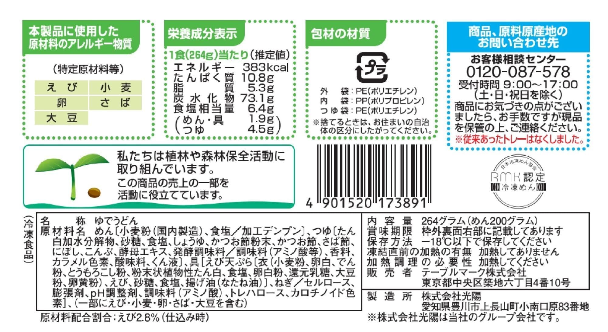 めん〔小麦粉(国内製造)、食塩/加工デンプン〕、つゆ〔たん白加水分解物、砂糖、食塩、しょうゆ、かつお節粉末、かつお節、さば節、にぼし、こんぶ、酵母エキス、発酵調味料/調味料(アミノ酸等)、香料、カラメル色素、酸味料、くん液〕、具[えび天ぷら〔衣(小麦粉、卵白、でん粉、とうもろこし粉、粉末状植物性たん白、食塩、卵白粉、還元乳糖、大豆粉、卵黄粉)、えび、砂糖、食塩、揚げ油(なたね油)〕、ねぎ/セルロース、膨張剤、pH調整剤、調味料(アミノ酸)、トレハロース、カロチノイド色素]、(一部にえび・小麦・卵・さば・大豆を含む)