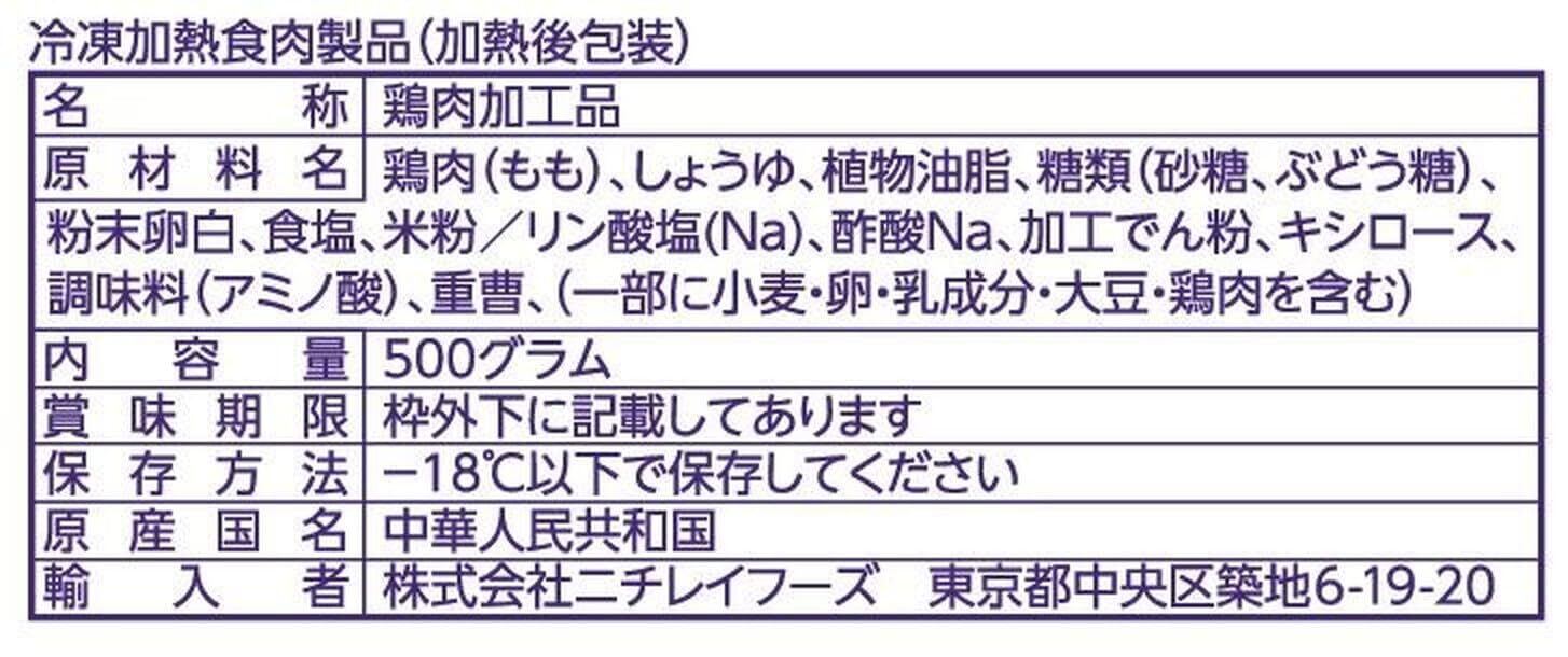 鶏肉(もも)、しょうゆ、植物油脂、糖類(砂糖、ぶどう糖)、粉末卵白、食塩、米粉/リン酸塩(Na)、酢酸Na、加工でん粉、キシロース、調味料(アミノ酸)、重曹、(一部に小麦・卵・乳成分・大豆・鶏肉を含む)