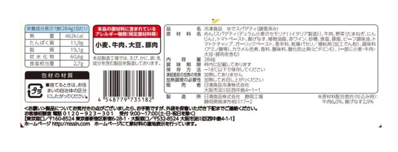 原材料: めん〔スパゲティ(デュラム小麦のセモリナ)(イタリア製造)〕、牛肉、野菜(たまねぎ、にんじん)、トマトペースト、揚げなす、植物油脂、赤ワイン、砂糖、食塩、豚脂、ビーフ調味油、トマトケチャップ、ガーリックペースト、香辛料、乾燥パセリ/増粘剤(加工でん粉)、調味料(アミノ酸等)、カラメル色素、香料、酸味料、酸化防止剤(ビタミンE)、(一部に小麦・牛肉・大豆・豚肉を含む)