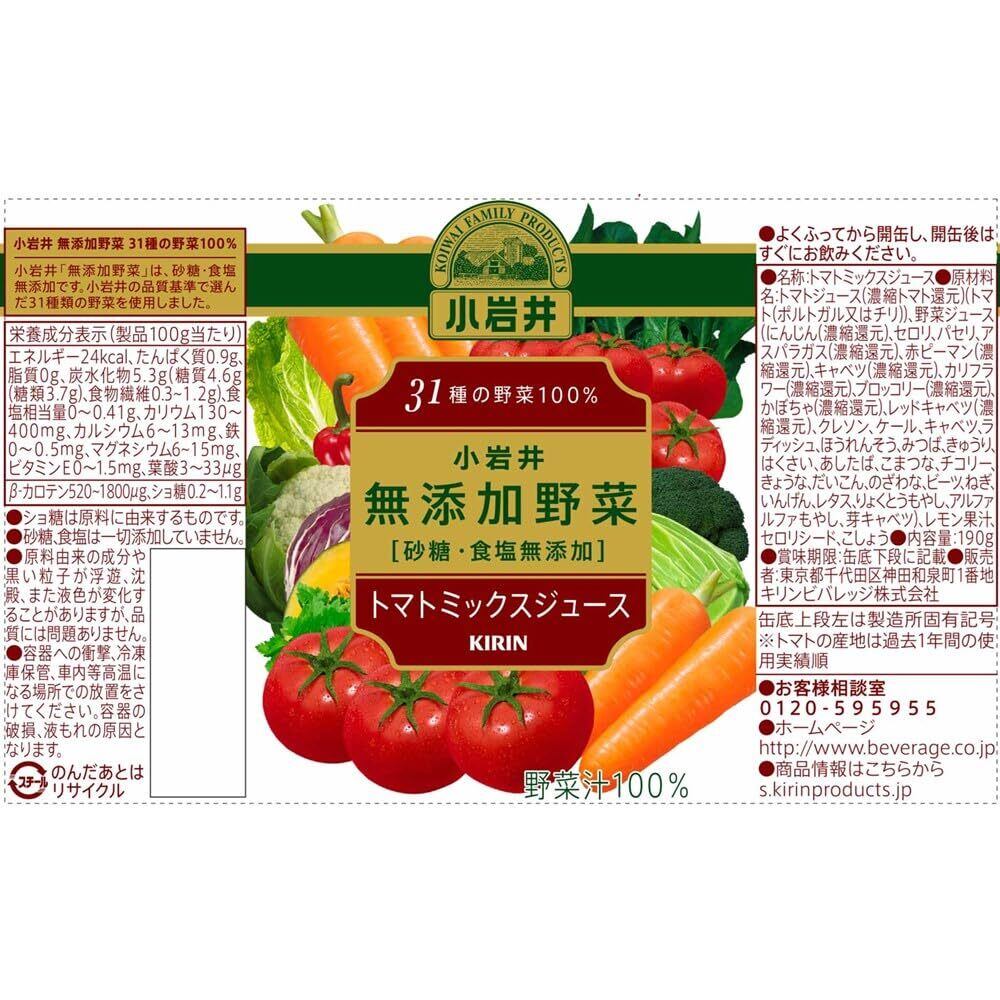 キリン 小岩井 無添加野菜 31種の野菜と果実 100% 190g 缶 30本 野菜ジュース トマトミックスジュース