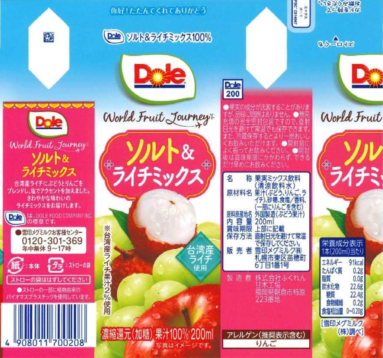 Dole World Fruit Journey ソルト&ライチミックス100%。台湾産ライチにりんごとぶどうをブレンドした果実ミックス飲料です。ライチのさわやかな甘未に塩味でアクセントを加え、すっきり飲みやすい仕立てです。(原材料・添加物)果汁(ぶどう、りんご、ライチ)、砂糖、食塩/香料、(一部にりんごを含む)