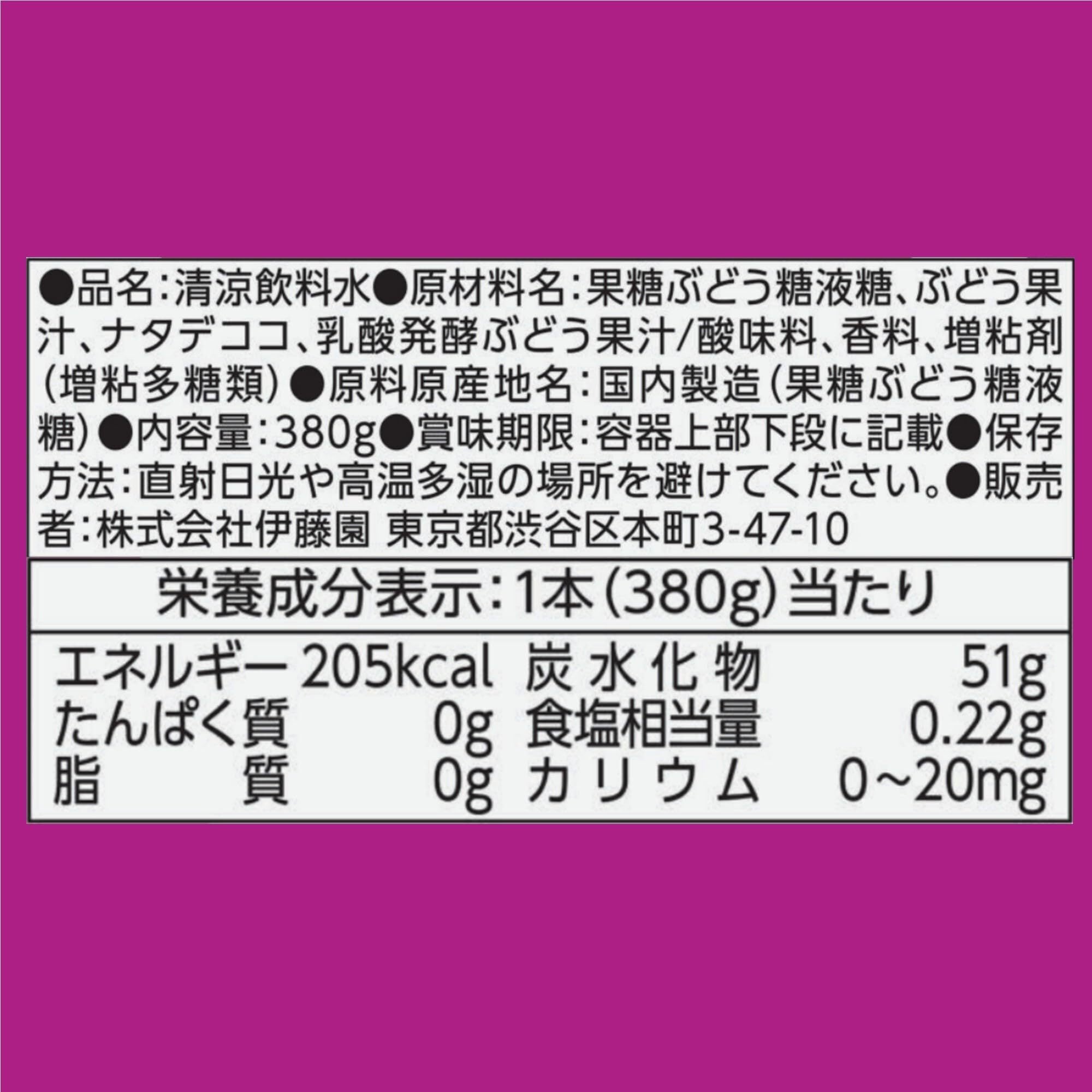 原材料:果糖ぶどう糖液糖、ぶどう果汁、ナタデココ、乳酸発酵ぶどう果汁/酸味料、香料、増粘剤(増粘多糖類)