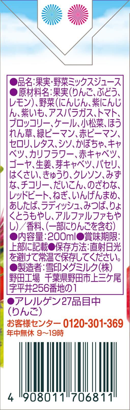 原材料:果実:りんご、ぶどう、レモン、野菜:にんじん、紫にんじん、紫いも、アスパラガス、トマト、ブロッコリ-、ケール、小松菜、赤ピーマン、緑ピーマン、ほうれん草、セロリ、レタス、シソ、かぼちゃ、キャベツ、カリフラワー。赤キャベツ、ゴーヤ、生姜、芽キャベツ、パセリ、はくさい、きゅうり、クレソン、みずな、チコリー、だいこん、のざわな、レッドビート、めぎ、いんげんまめ、あしたば、ラディッシュ、みつば、りょくとうもやし、アルファルファもやし、香料