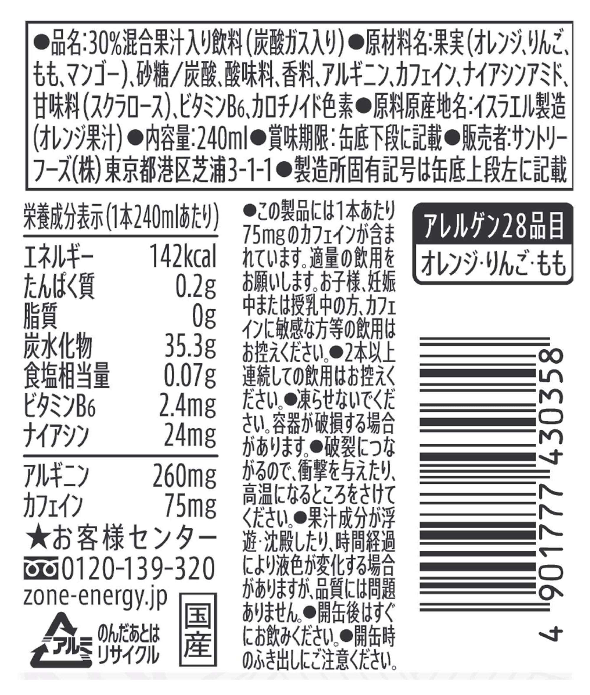 原材料:果実(オレンジ、りんご、もも、マンゴー)、砂糖/炭酸、酸味料、香料、アルギニン、カフェイン、ナイアシンアミド、甘味料(スクラロース)、ビタミンB6、カロチノイド色素